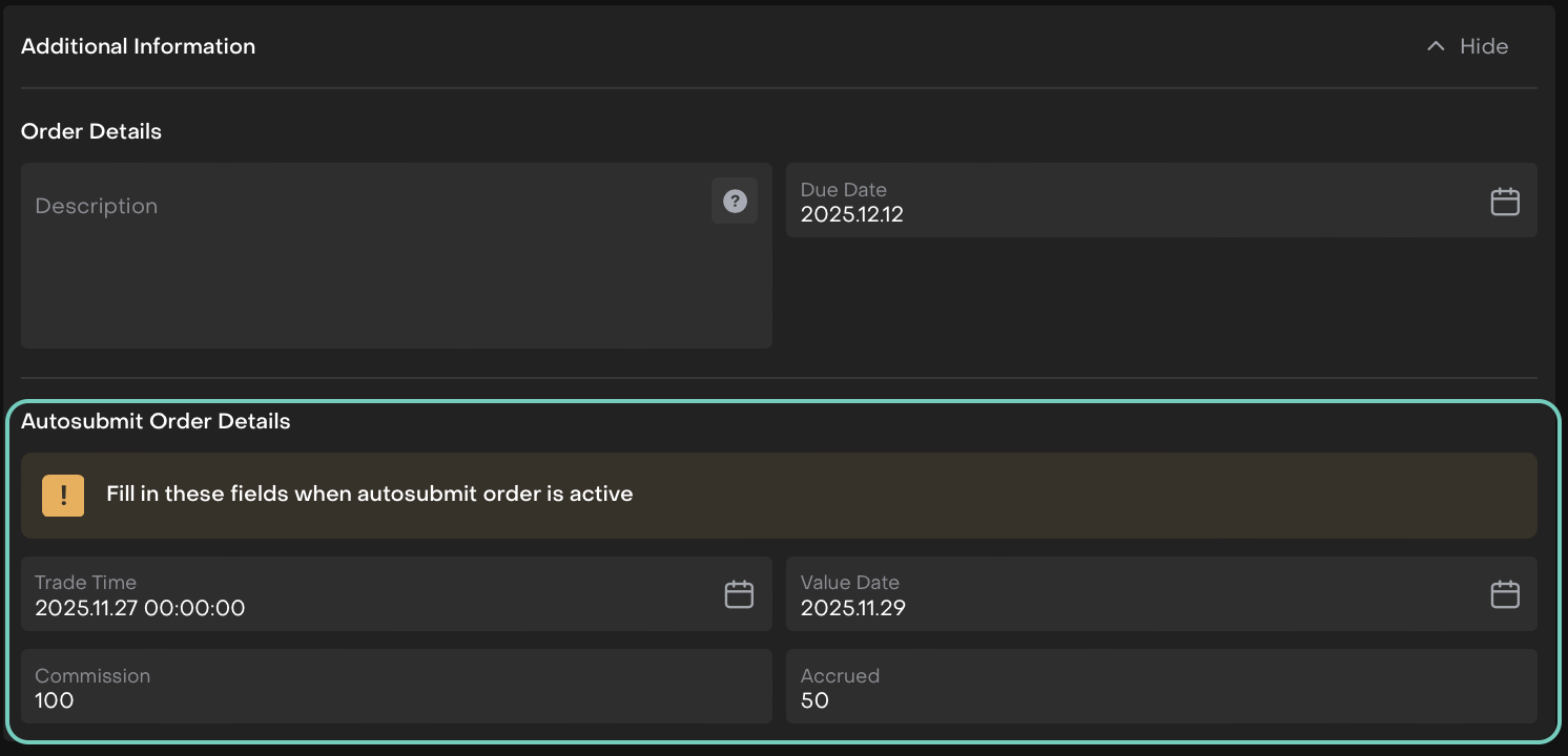 In the Additional Information section of the form, find the Autosubmit Order Details panel.