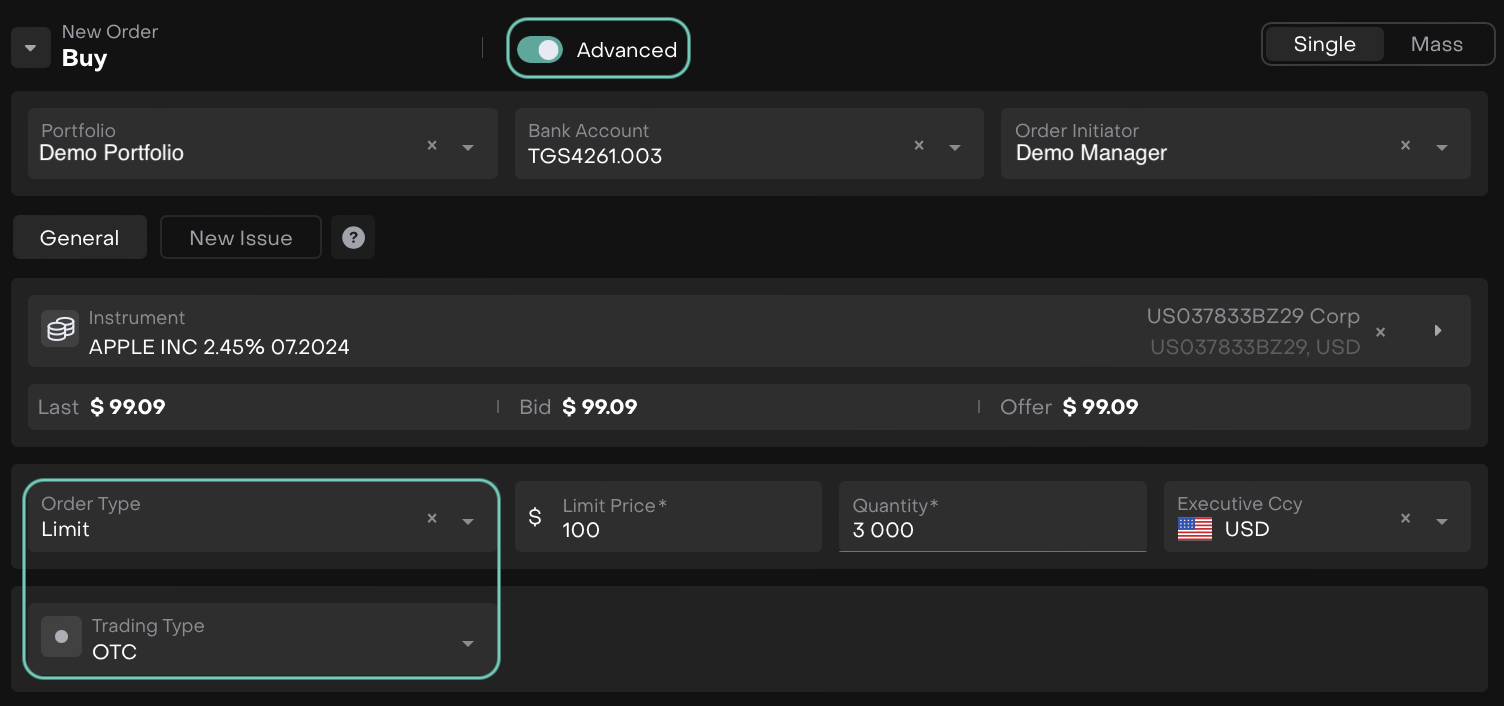 For Buy/Sell types, enable Advanced mode to fill in additional fields or options.