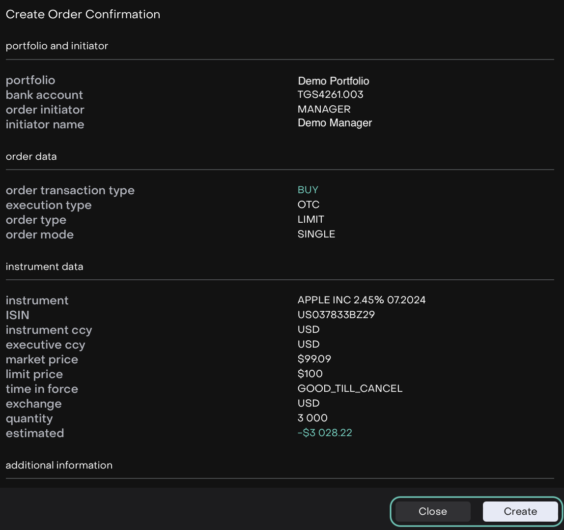 Then, click Buy in this case and reconfirm by clicking on Create or to discard click Close.