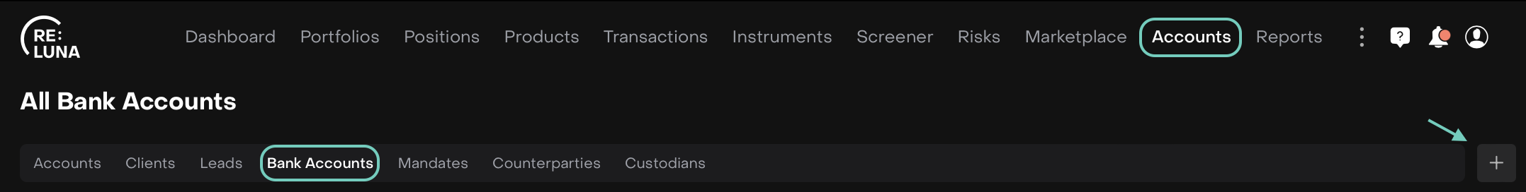 The Bank Account section of the Reluna platform provides information about the types of bank accounts available, terms and conditions for opening and using accounts, and information about fees. To create a bank account, you must have Bank Account, Account, and Custodian view rights.