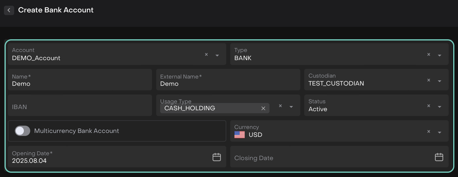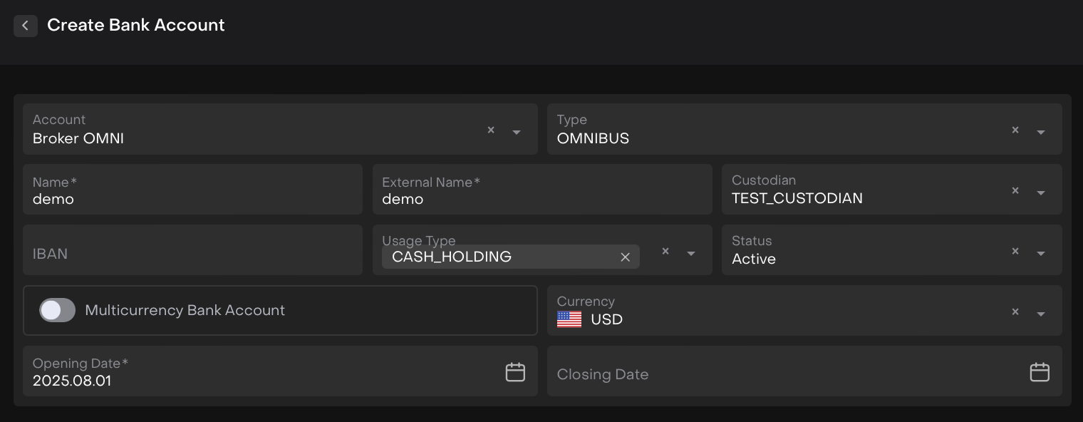 Bank Account is an object of a real bank account in one of the Custodies. A bank account can belong to both Account type Individual and Entity.