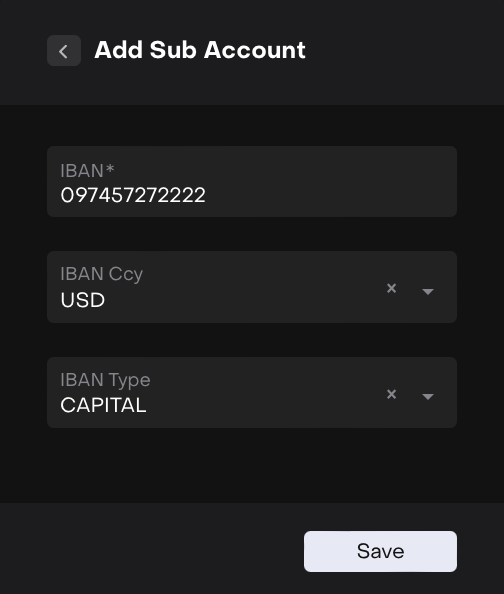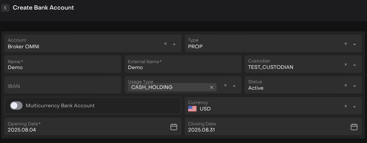 A Prop Bank Account is a company-owned bank account. The creation process is the same as for an Omnibus Bank Account, except that the Type field must be selected as Prop.