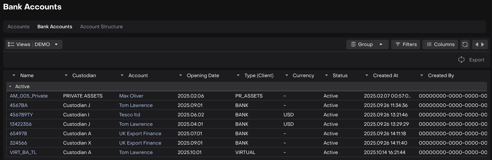 ID | A unique identifier (UUID) assigned to each bank account. | Serves as a system reference for linking and tracking records. |