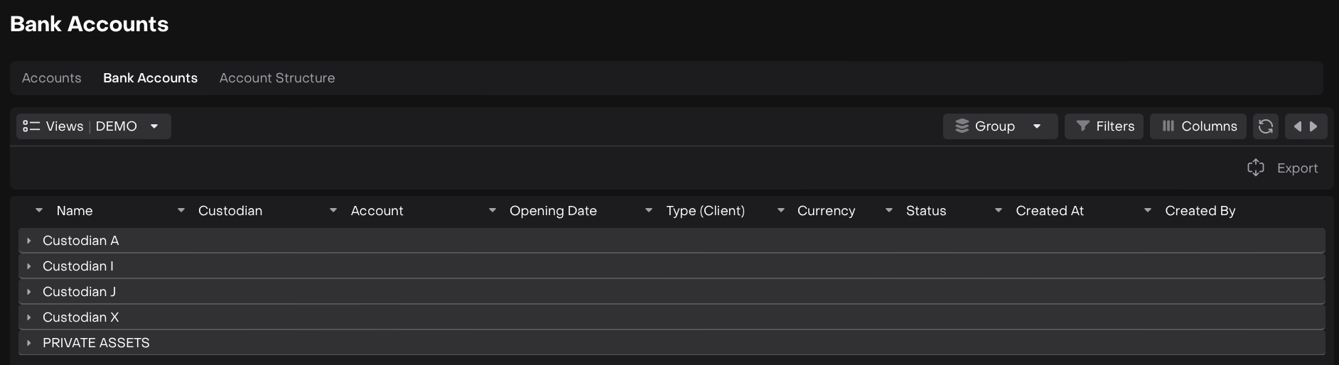 CUSTODIAN | The financial institution or custodian holding the account. | Links the account to its managing bank or custodian institution. |