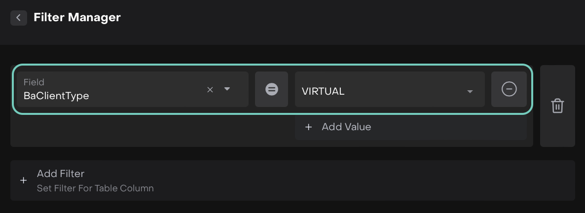 BACLIENTTYPE | Defines the client type associated with the bank account. Options are: BANK CARD PR_ASSETS VIRTUAL VIRTUAL_TTCA