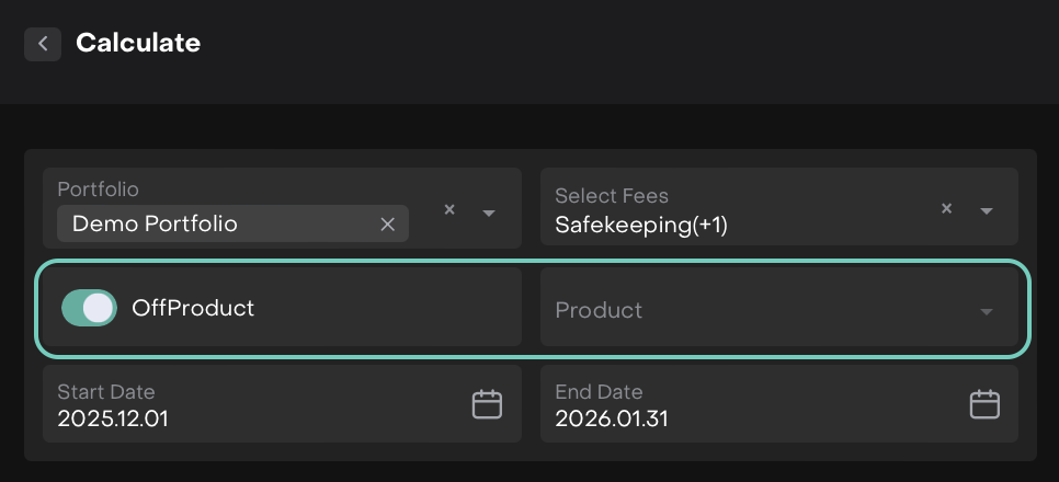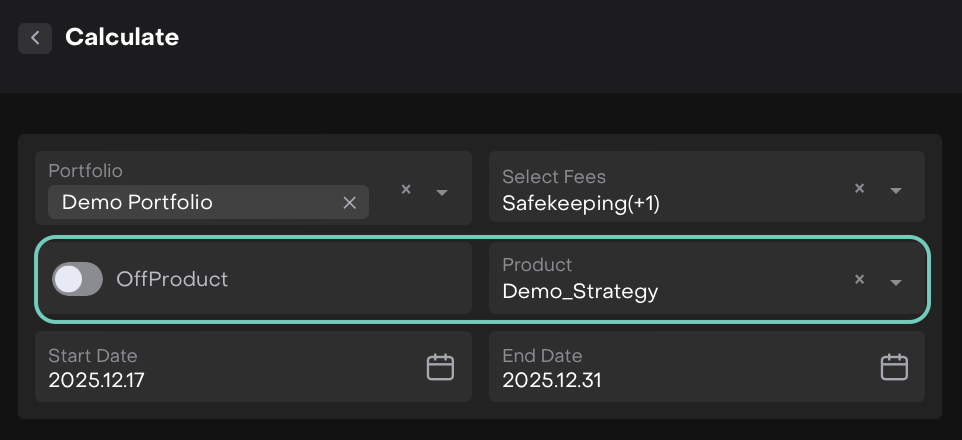 The platform allows you to calculate management fees efficiently using flexible configuration options. Fees can be generated for entire portfolios or for individual strategies, depending on your operational needs. This guide explains the available calculation modes, required fields and the actions you can take after a fee is calculated.