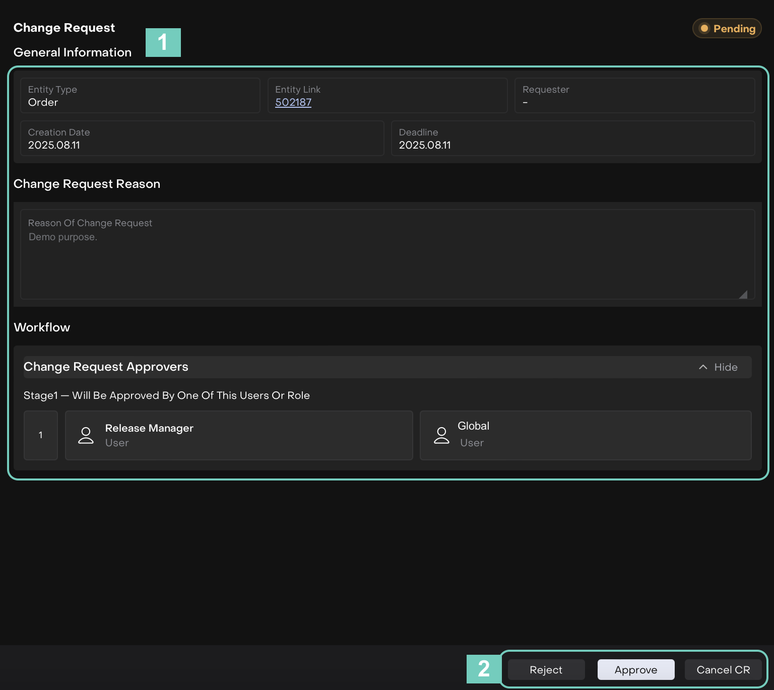 Actions – buttons to Approve, Reject or Cancel the request (depending on Change Request settings).