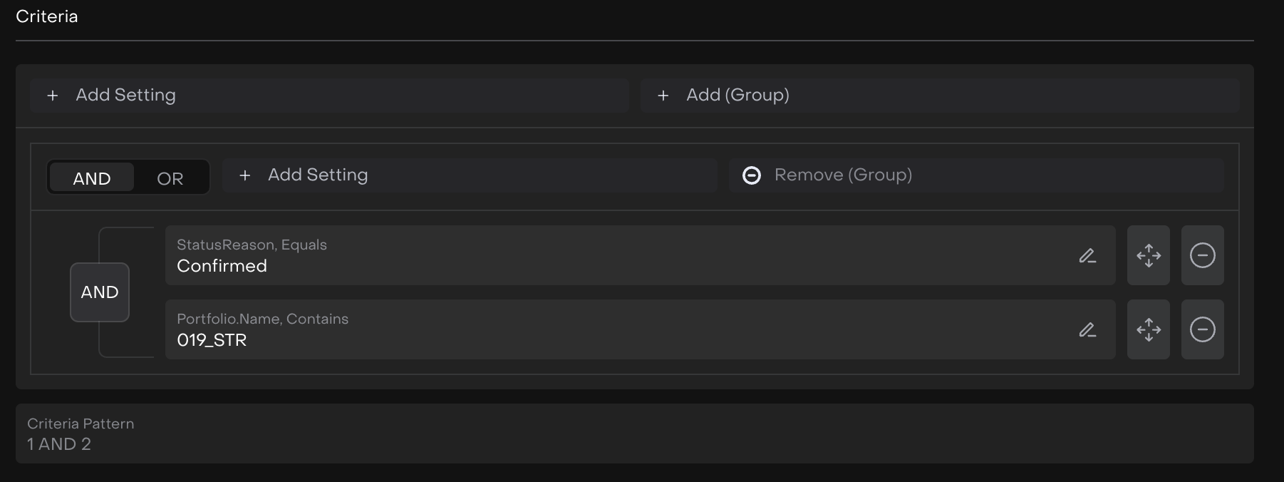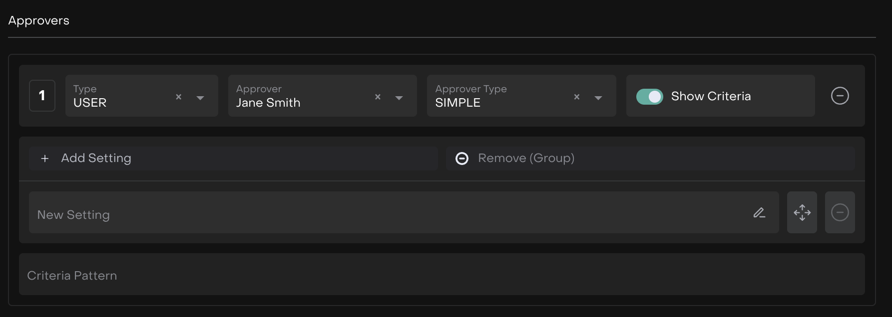 Criteria | Conditions defined using Add Group or Add Setting that determine when a Change Request process will run. Multiple criteria can be combined using AND / OR logic. |