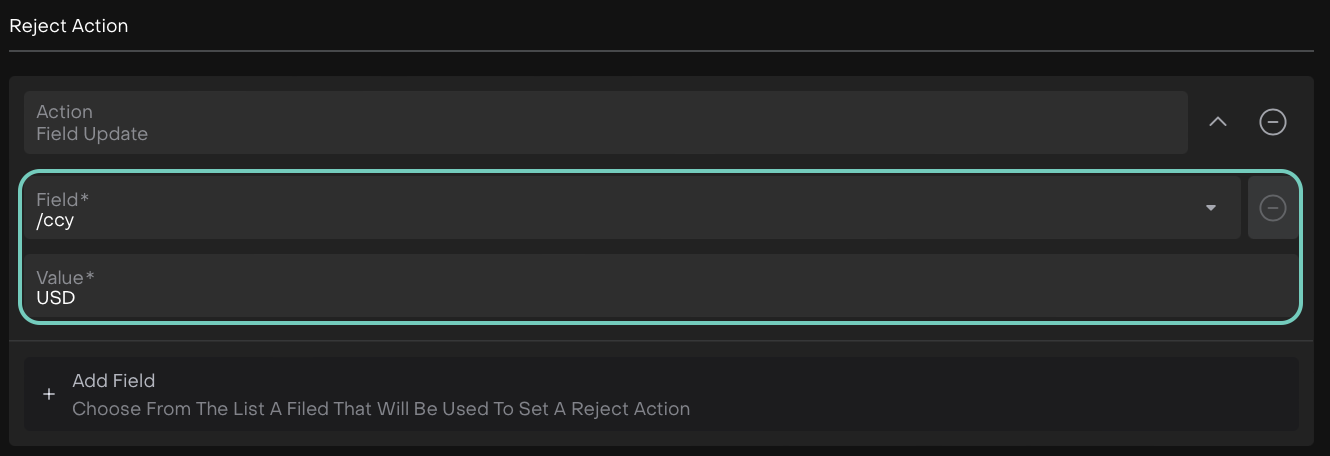 Select Field and Value (*) from the list that will determine the action to be triggered upon rejection.