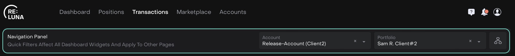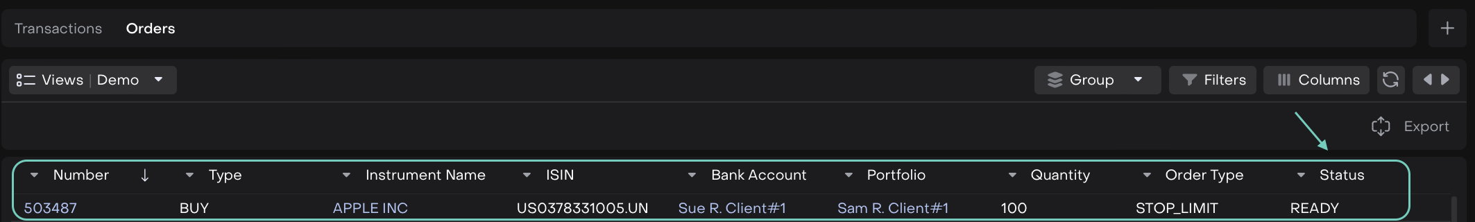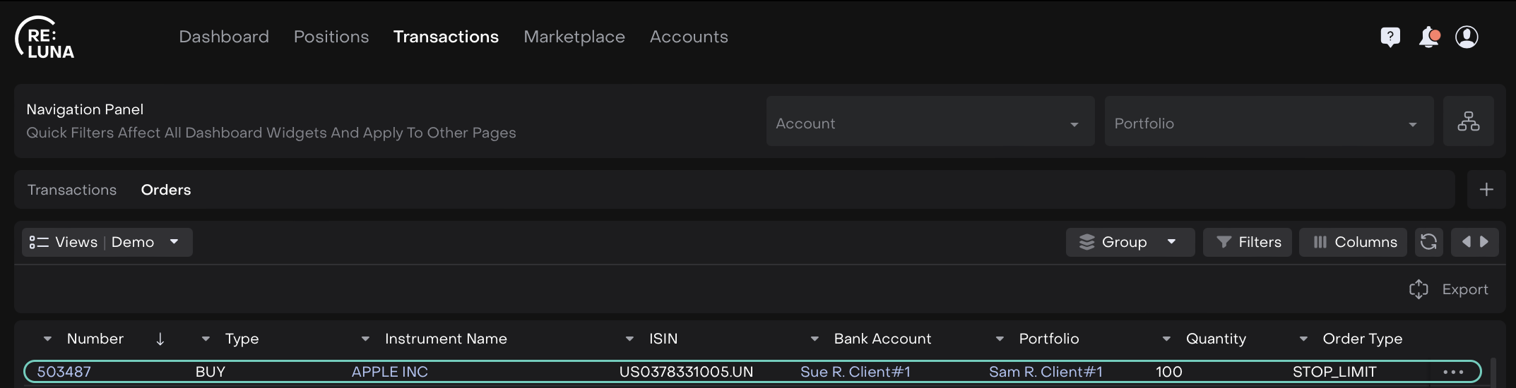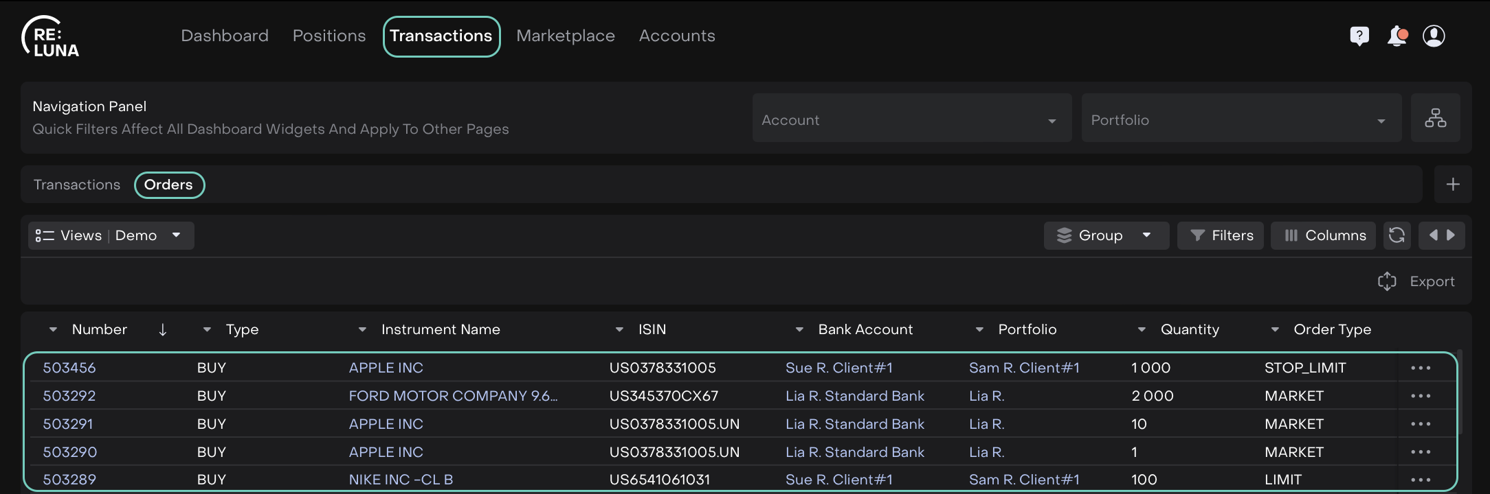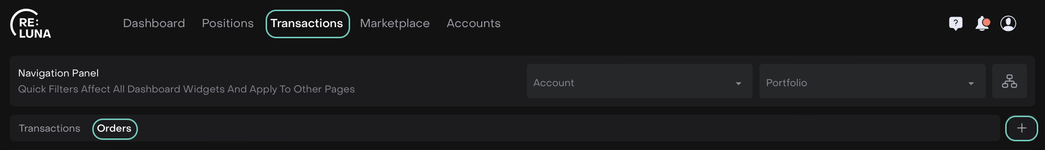 Once you make a selection, the orders table automatically updates to show only the relevant orders for your chosen account and portfolio.