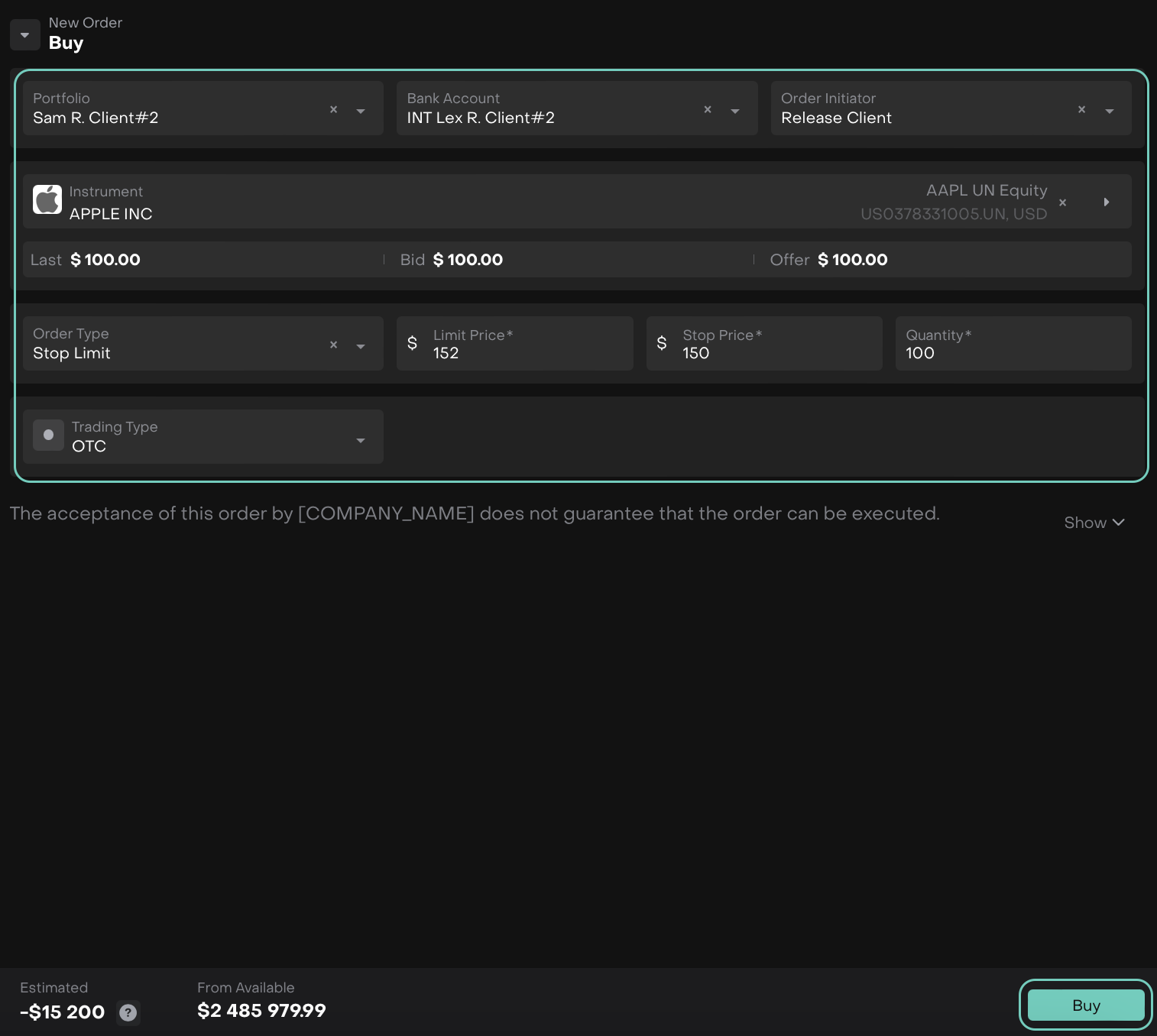 In the Order Form, fill in the following mandatory fields and click on action button (Buy).