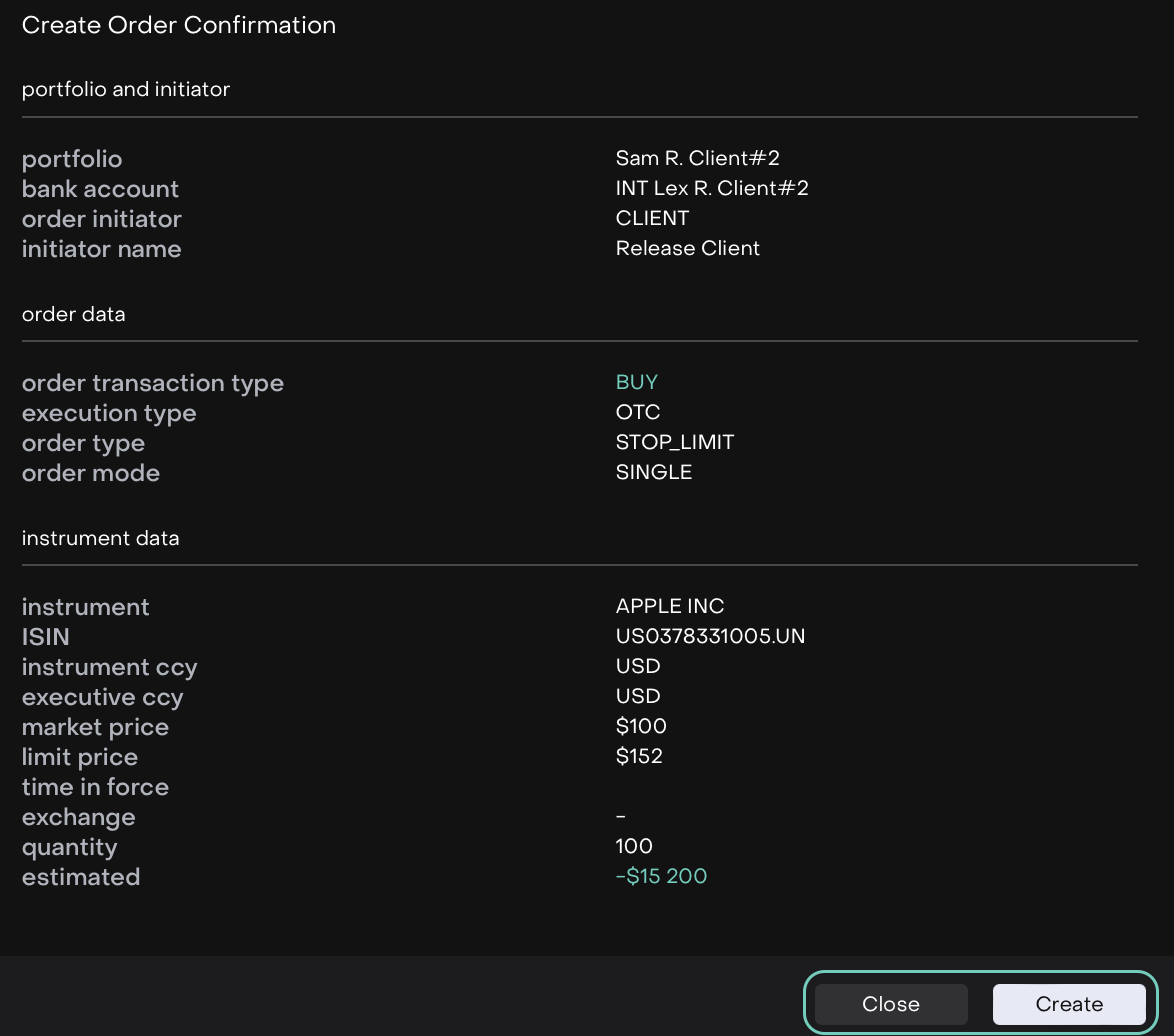 Review your order summary and Confirm creation or click Close to go back.