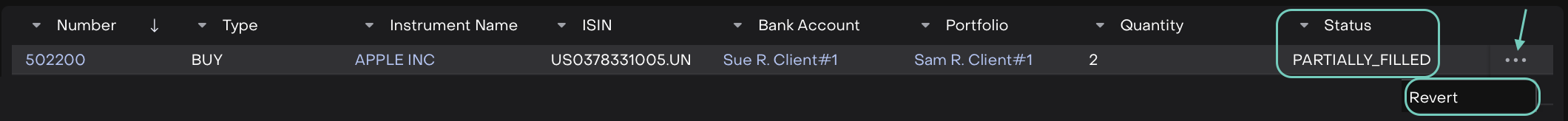 Revert | An action available only when an order is Partially Filled, allowing you to reverse remaining unfilled quantities. |