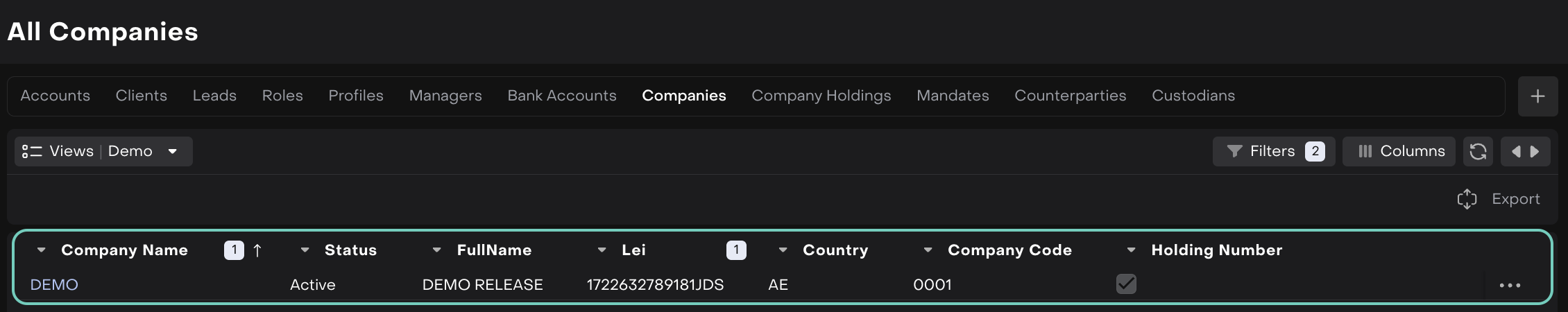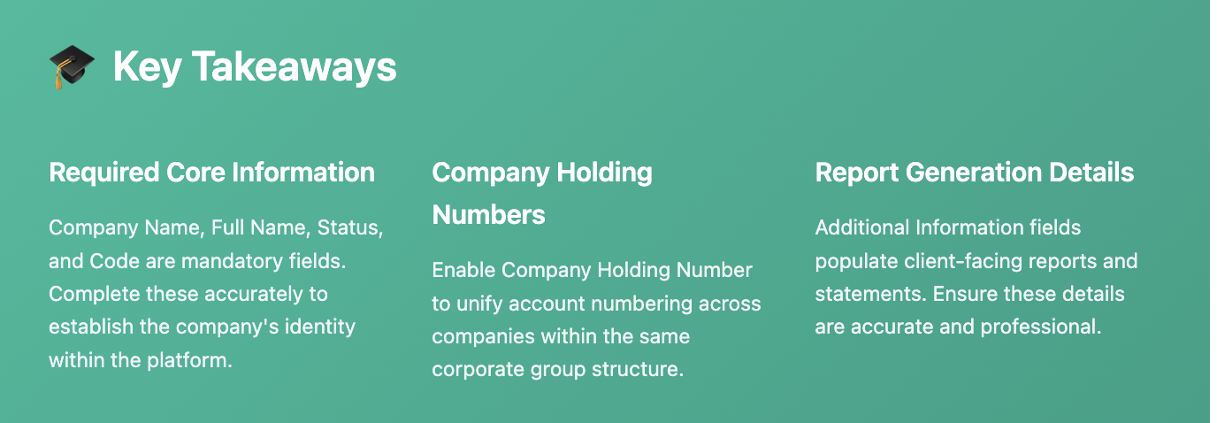 Use this feature to create new companies, define their structure within holdings, and configure company-specific settings such as LEI codes, regulatory identifiers, and account numbering preferences.