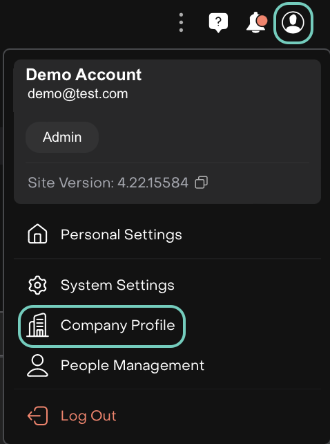 From the main menu page, go to User Settings icon > Find Company Profile.