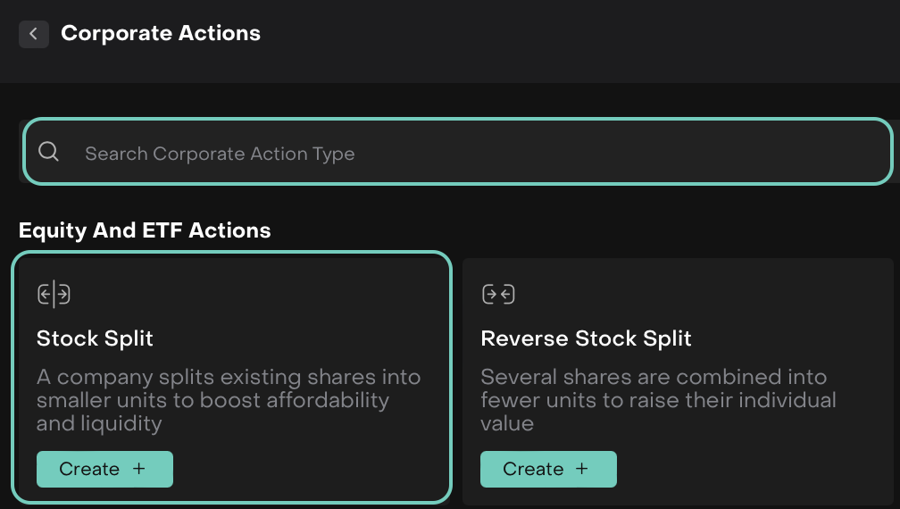 Before you can apply a corporate action to an Order, you must first create the corporate action under the Instrument. Once created, it will appear for selection when creating or updating relevant orders.