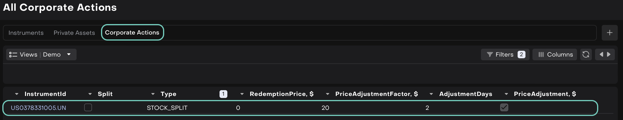 Go to the Corporate Actions tab Dashboard under Instruments.
