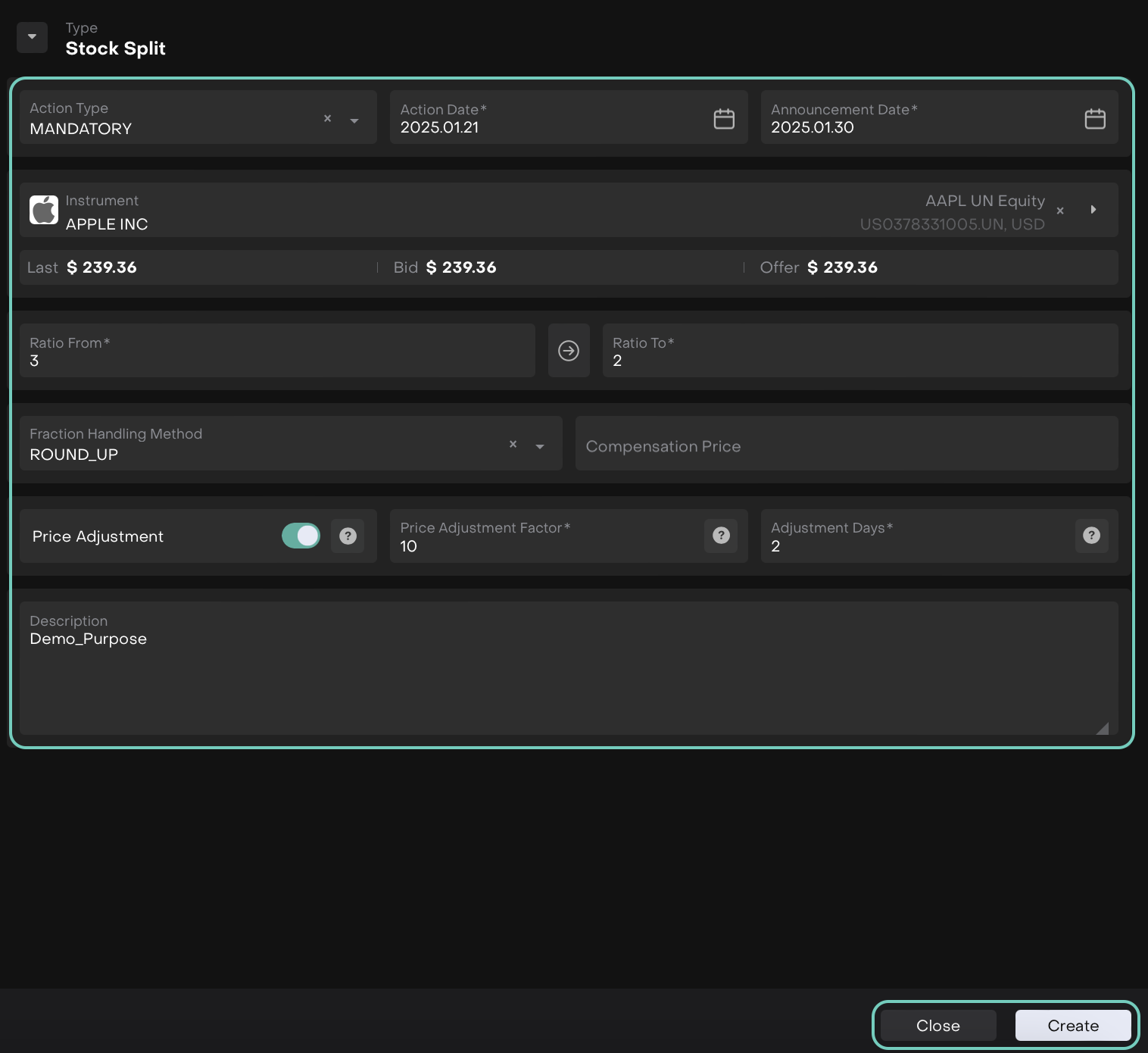 Price Adjustment | Adjusts the historical price of the original instrument from the Action Date using the adjustment coefficient. |