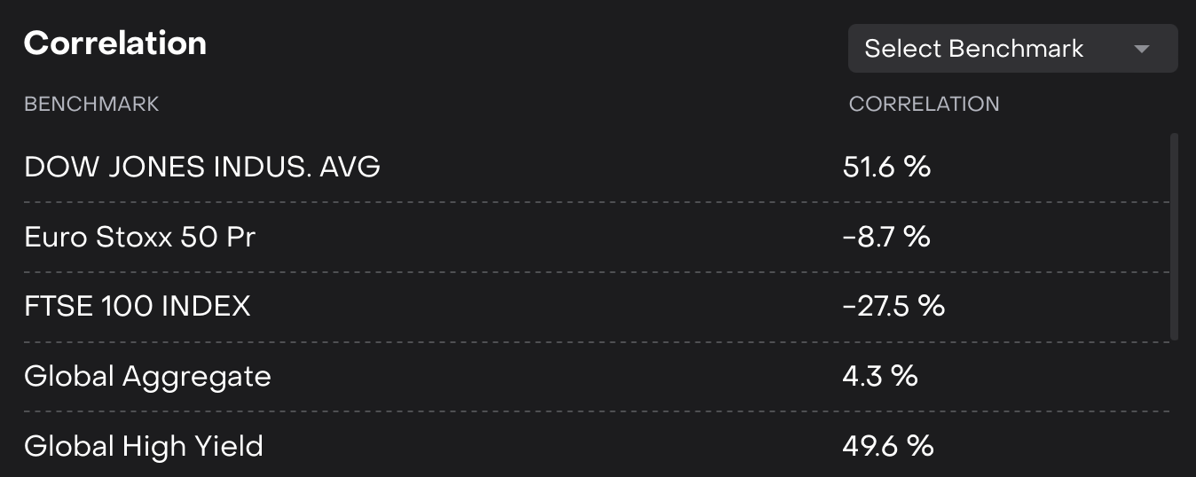 Displays correlation percentages (%) between your portfolio returns and selected benchmarks.