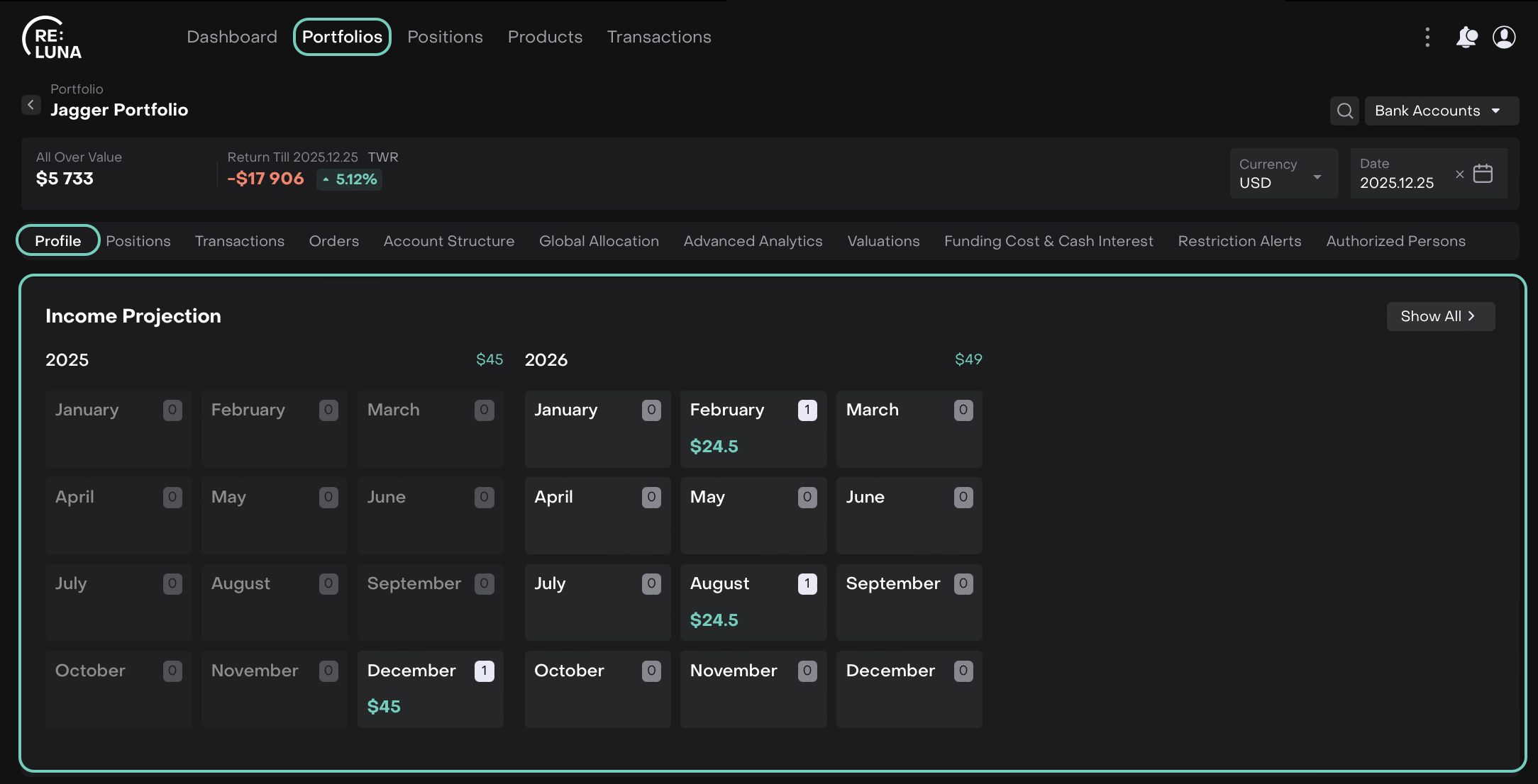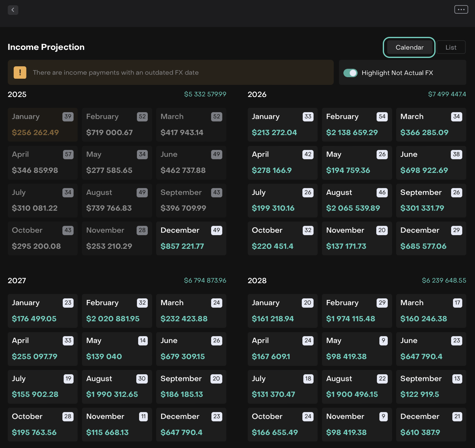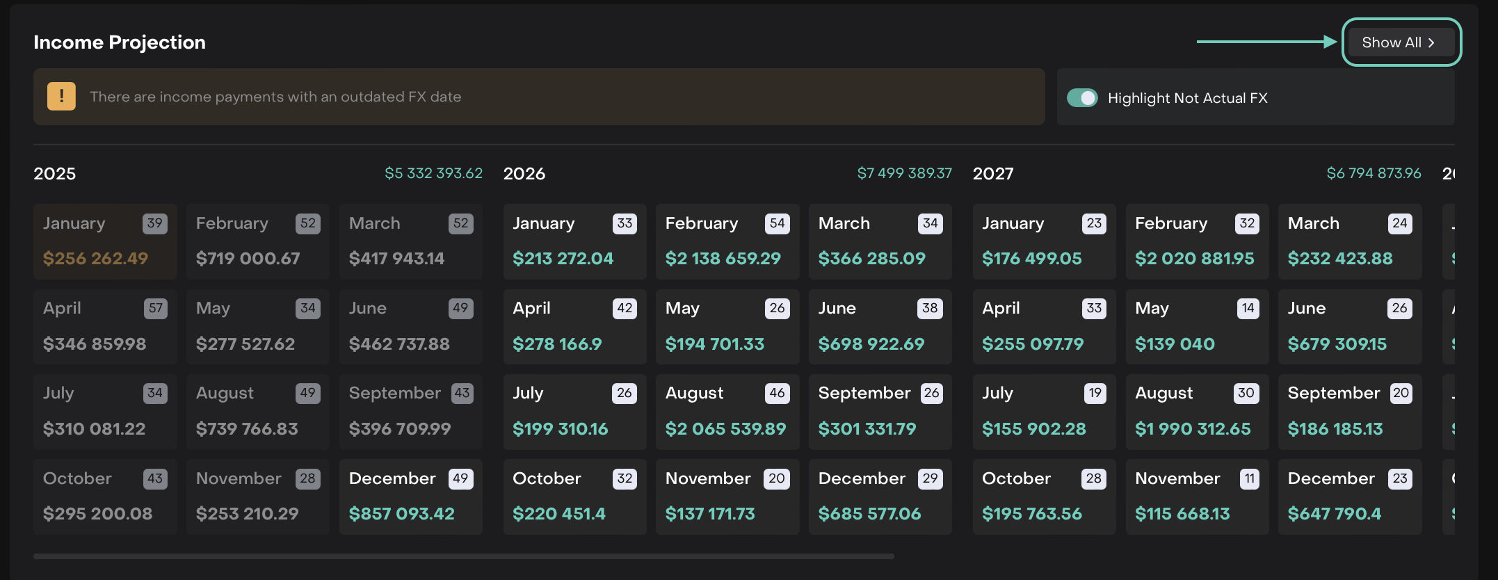 The Income Projection widget helps you track both upcoming and historical income for instruments held in your portfolio, including bonds, treasury bills, swaps, notes and other coupon- or dividend-bearing securities.