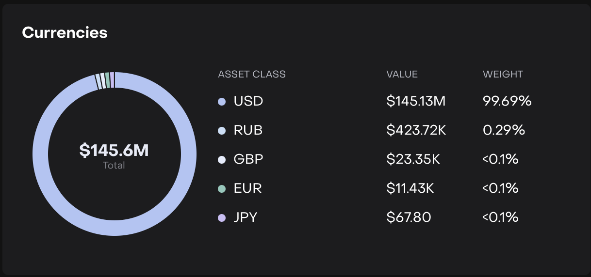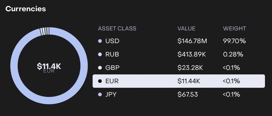 The Currencies Widget shows the distribution of your portfolio’s assets by currency. It helps you quickly see your currency exposure, understand which currencies dominate your portfolio and identify concentration risk.