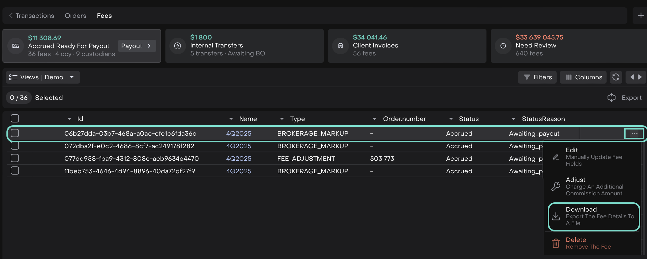 When you calculate fees on the platform, you can export detailed files summarizing the fee data by clicking the three dots menu (…) next to each fee entry in the table and selecting Download.