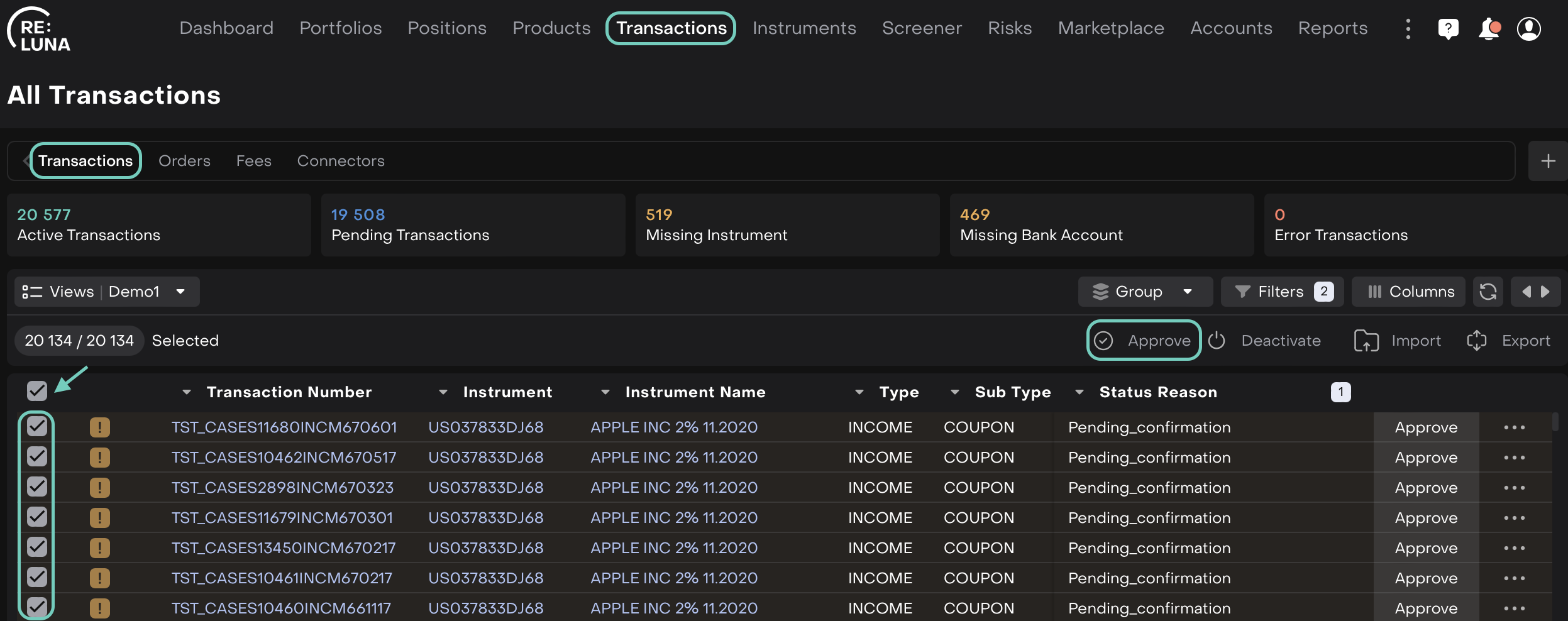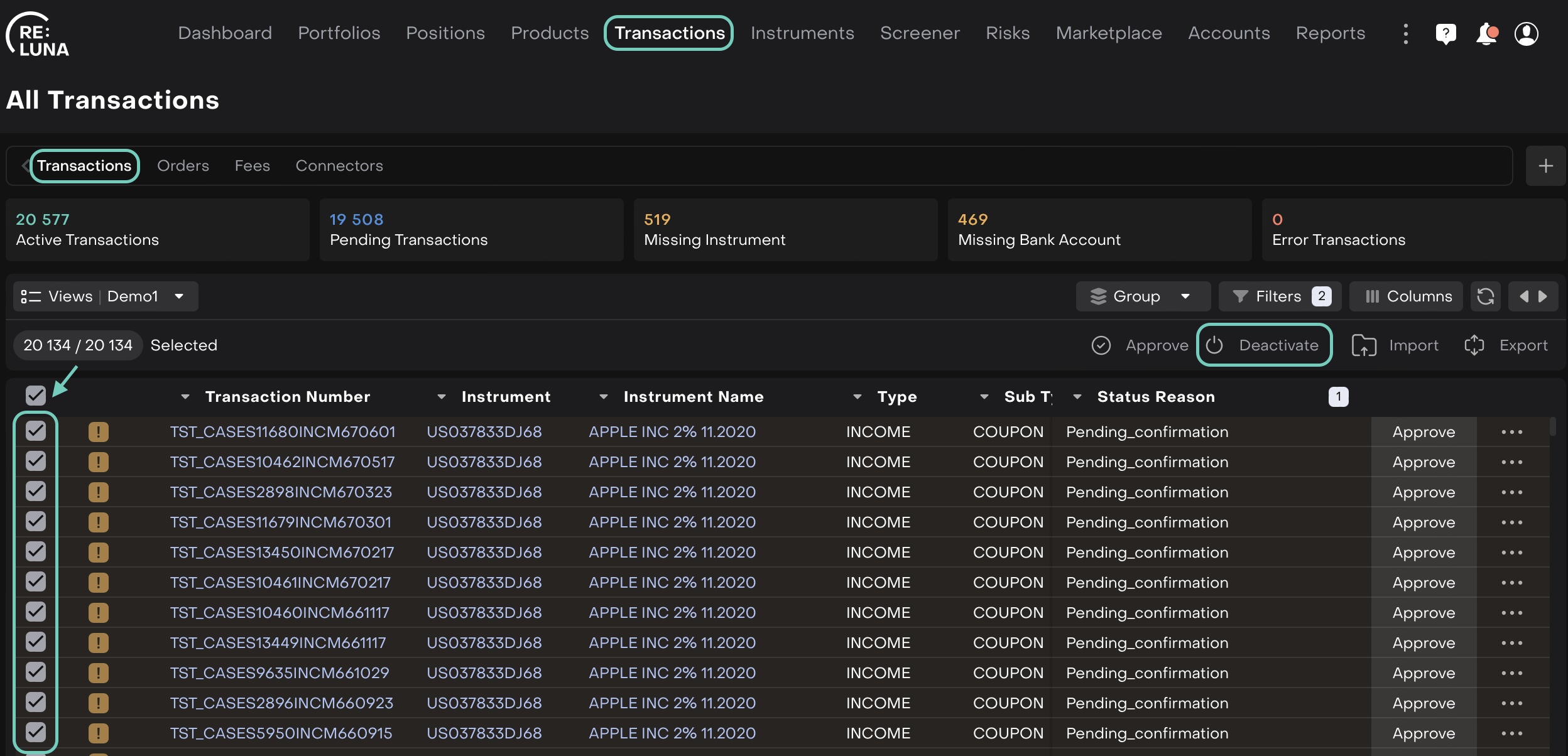 The Reluna platform now offers enhanced control over transaction statuses via three new bulk actions: Activate, Approve and Deactivate. These actions can be performed directly from the Transactions tab and allow you to manage multiple transactions simultaneously based on their status.