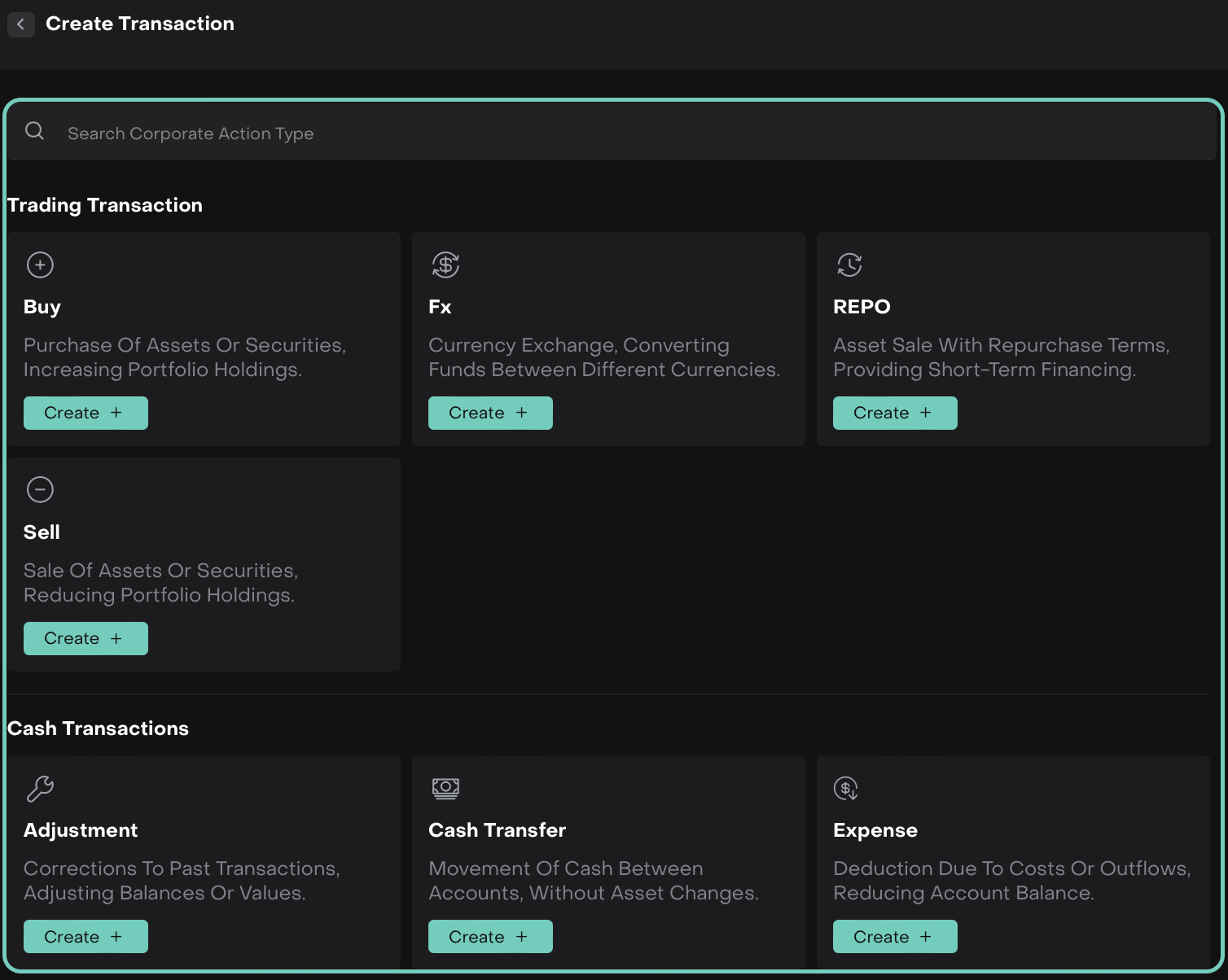 Once clicked on Create + the selected type’s transaction form opens.