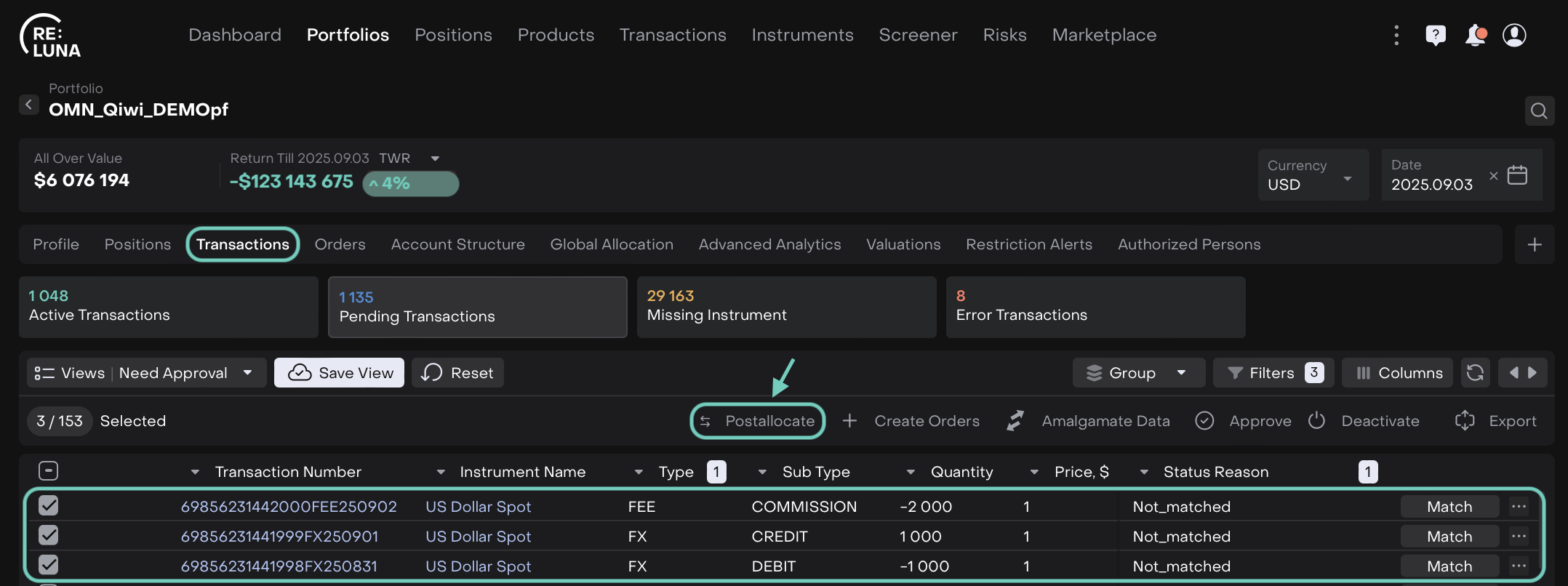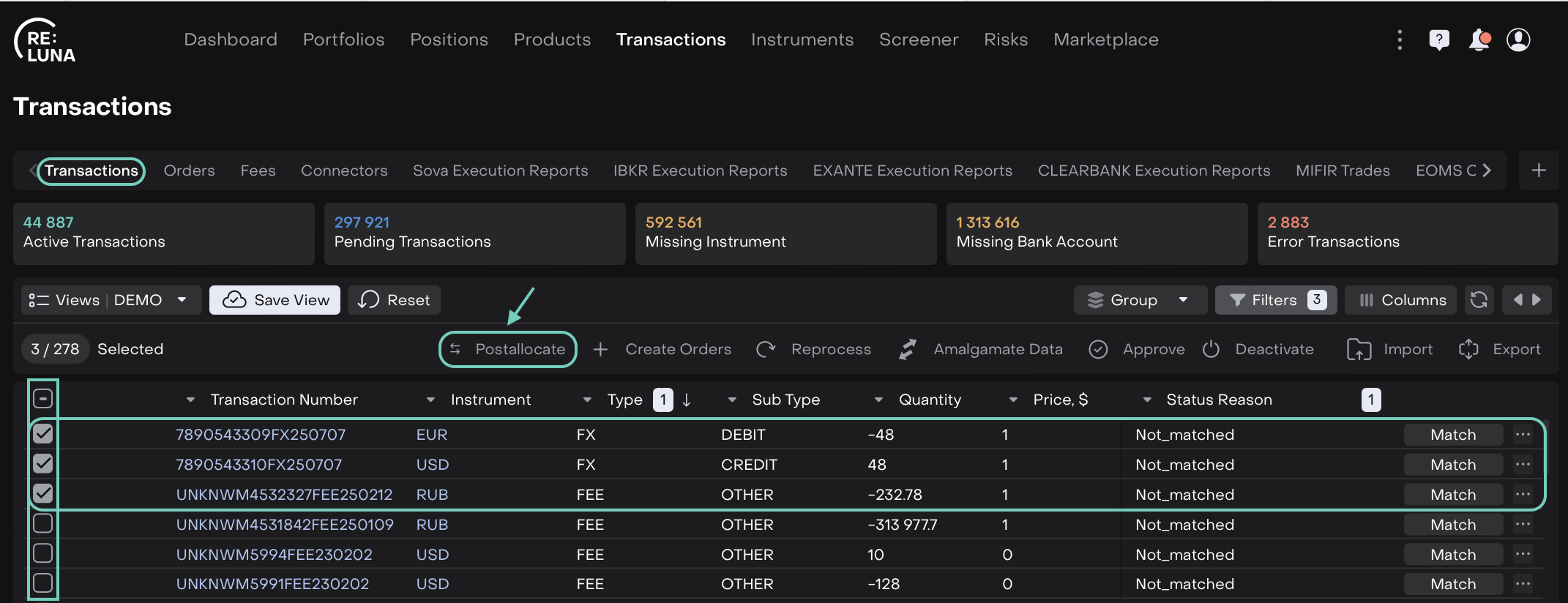 On the Reluna platform, you can postallocate FX transactions that include FX (DEBIT) and FX (CREDIT) transactions, and optionally a FEE transaction. This mechanism ensures your FX transactions are correctly processed, creating corresponding SELL FX orders automatically and updating the transaction status to Confirmed.