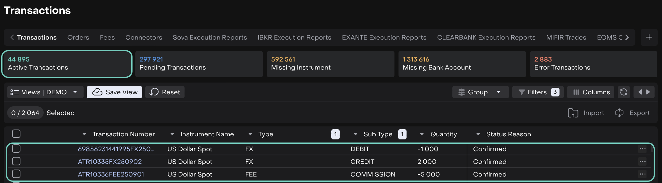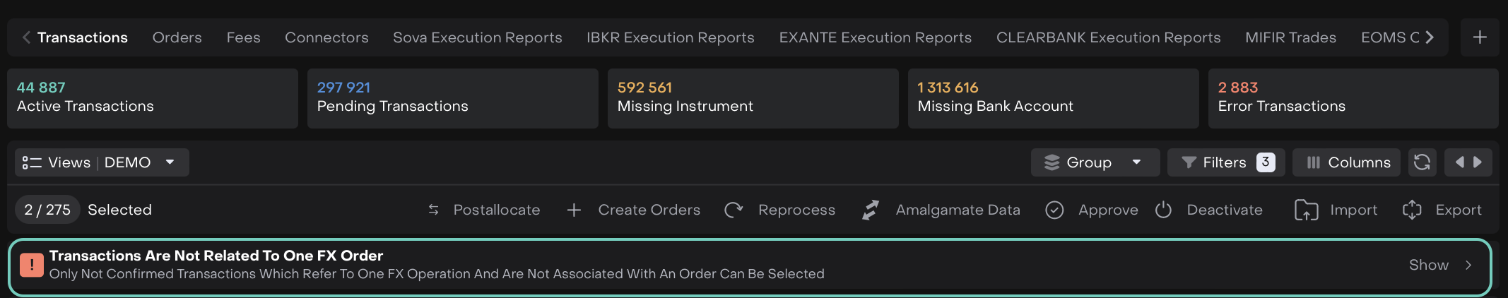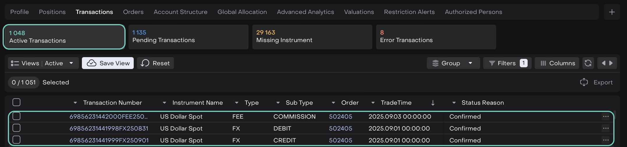 All selected FX transactions and associated Commission transactions are updated to Confirmed status.