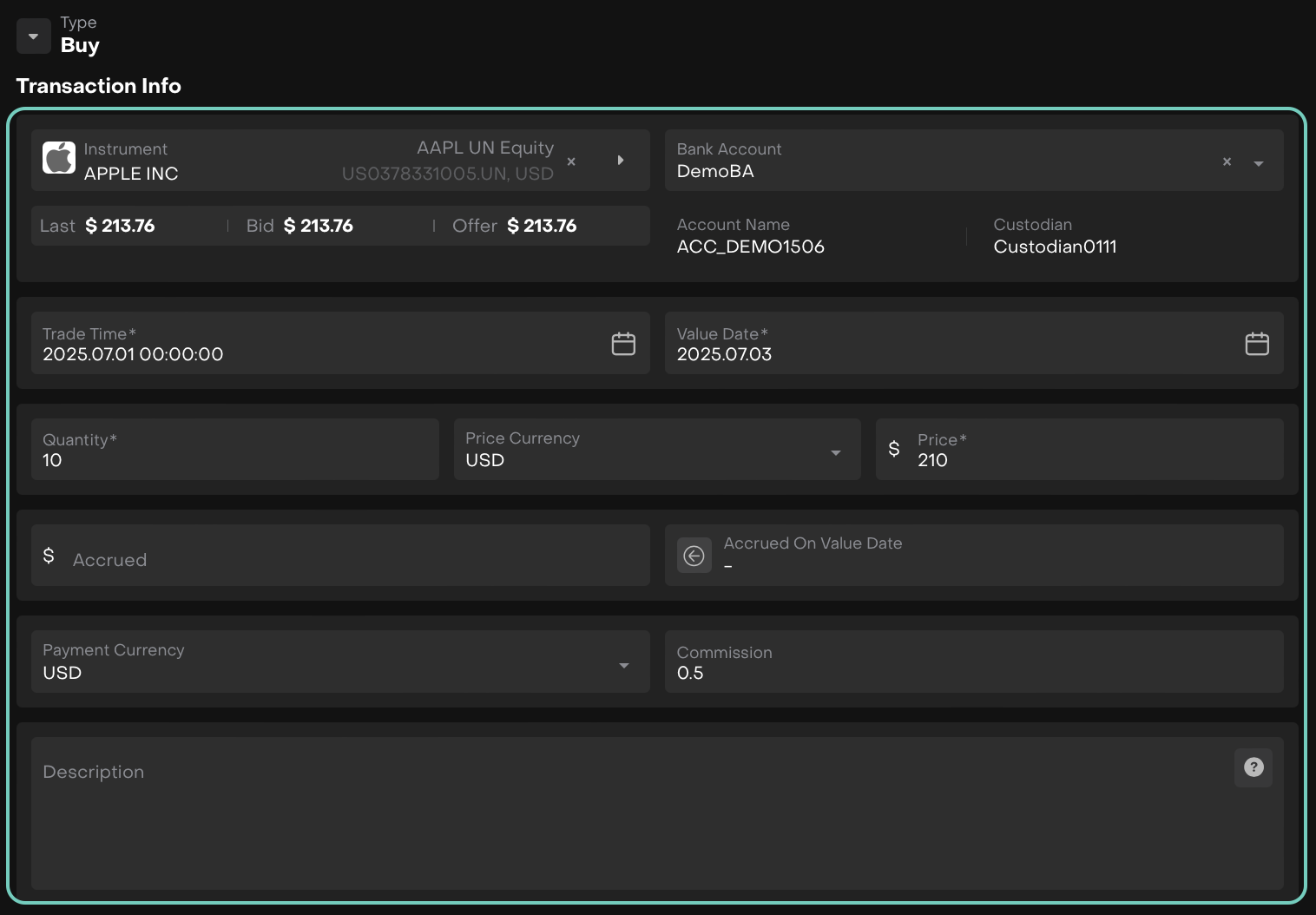 Let’s use a BUY transaction as an example to explain the form structure and flow.