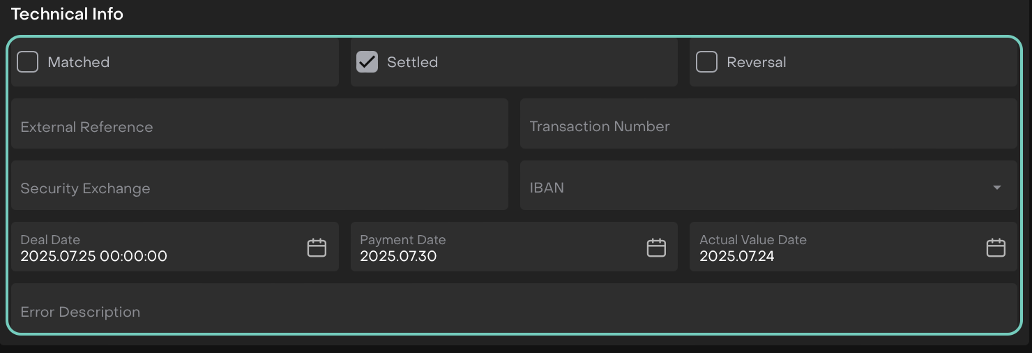 Settled (Checkbox) | Marks transaction as fully settled in cash and securities. |