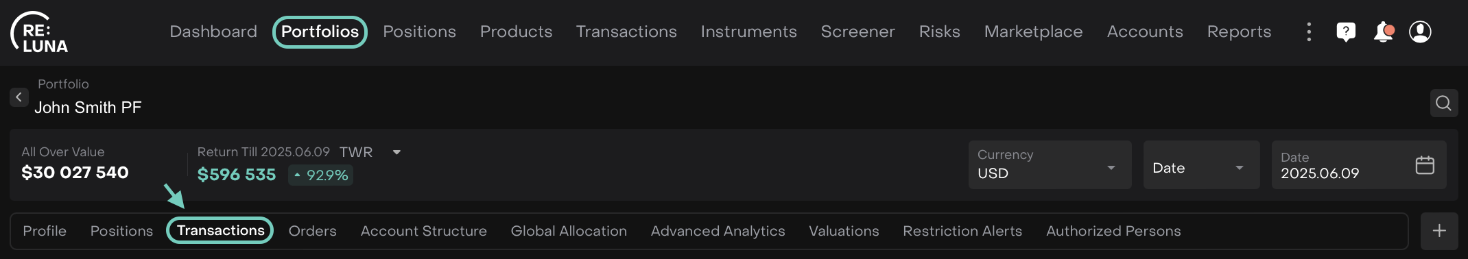 Go to the Transactions tab (either within a Portfolio or via All Transactions).