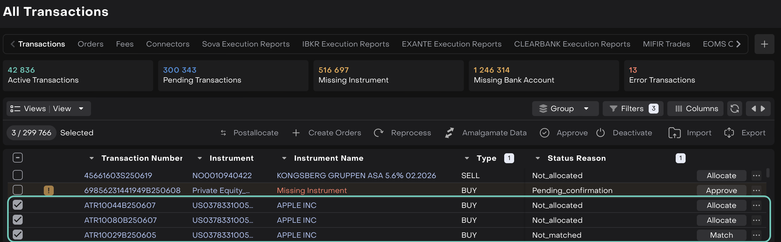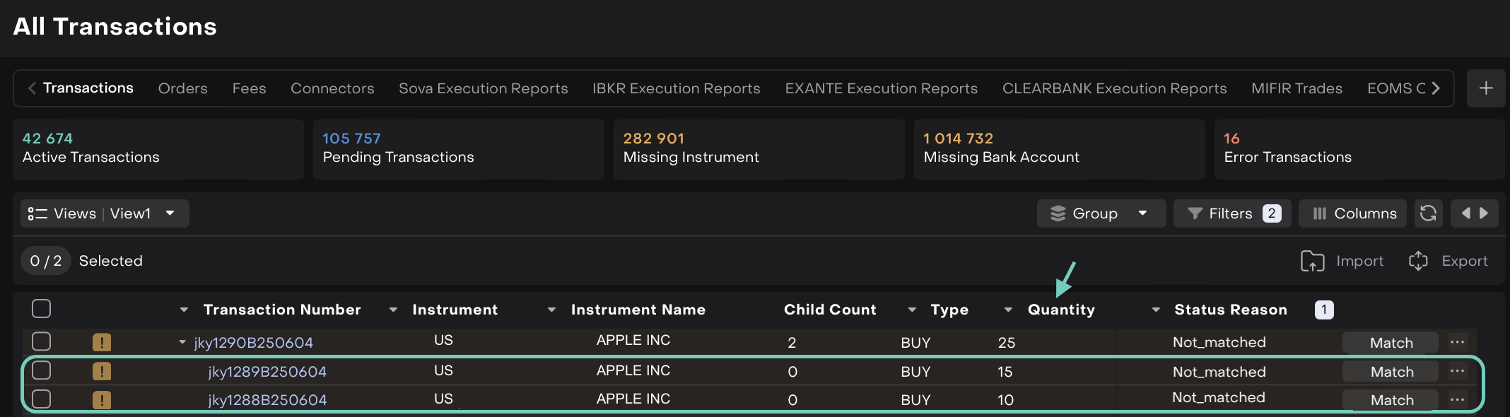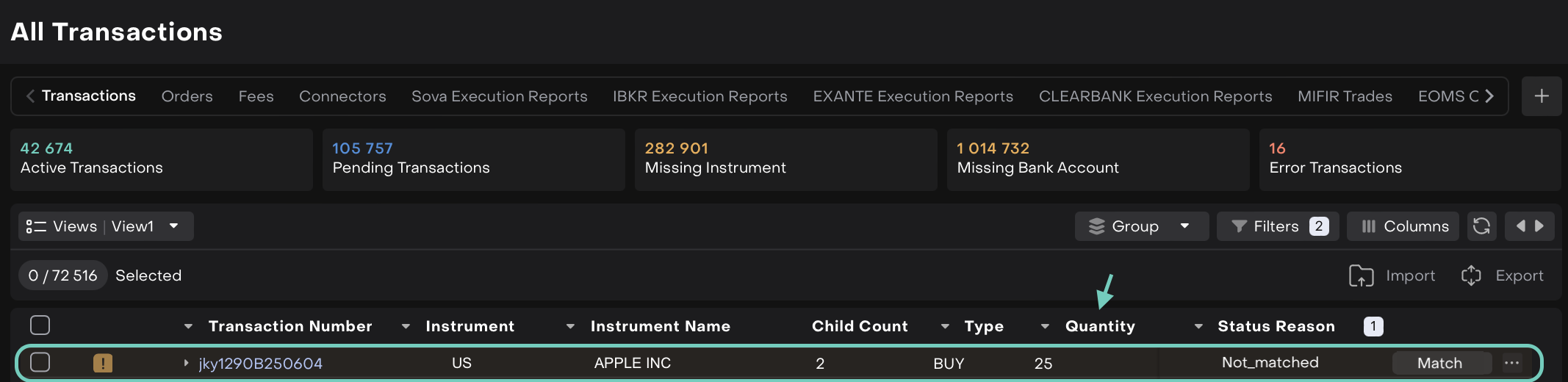 Filter by Type (e.g., BUY), Instrument Name or Transaction Number, etc to narrow down relevant entries.