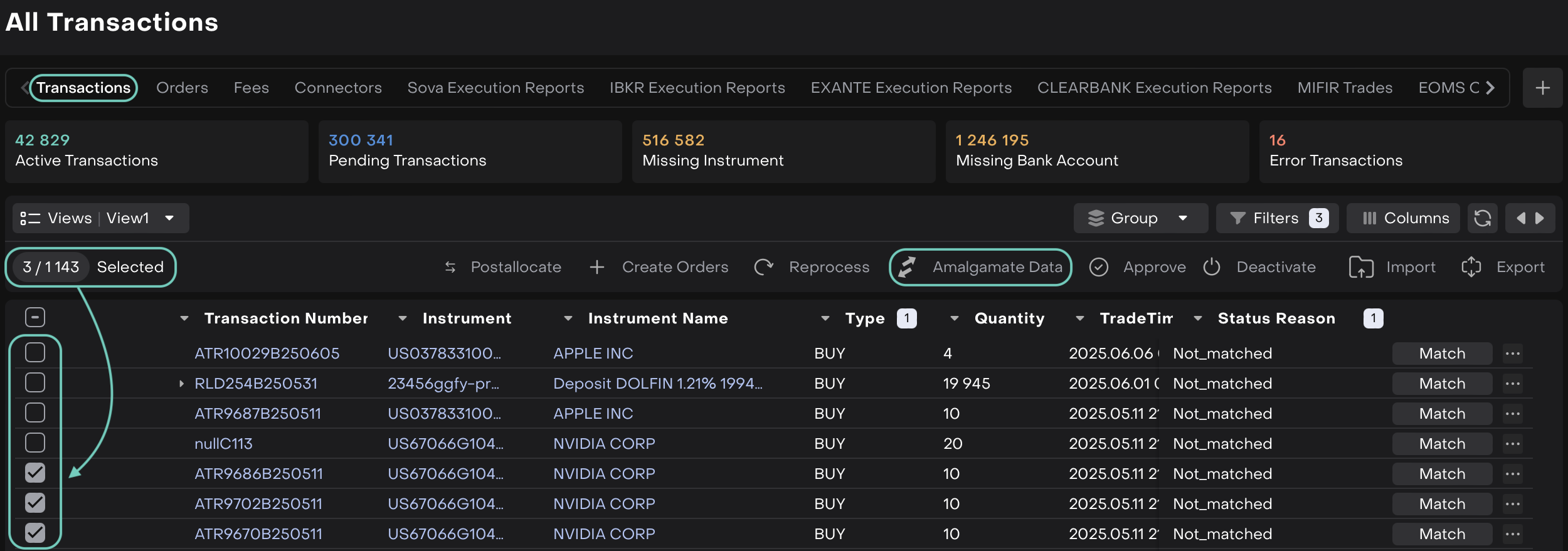 Amalgamate | Combines several transactions into one parent transaction with total quantity and average price. |