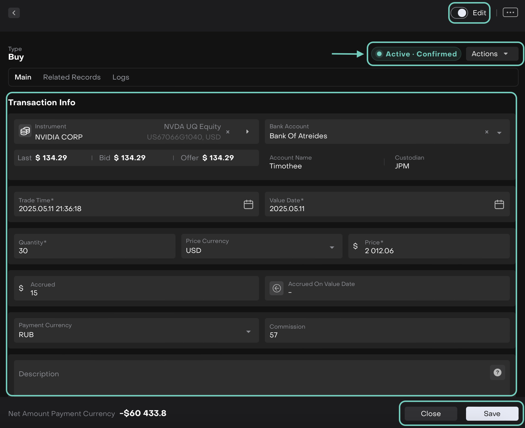 Click Edit to make changes or change the status from Actions button.