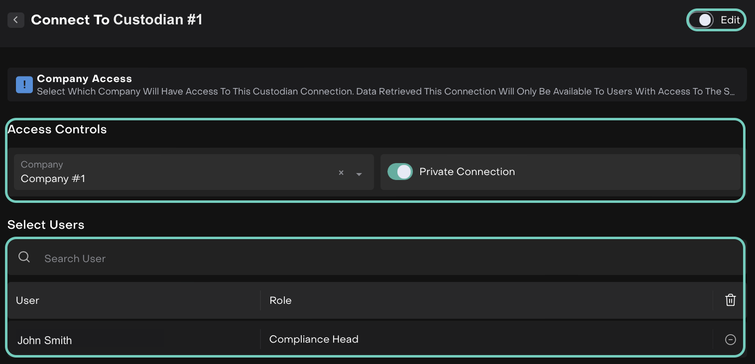 Once a custodian is created and saved, you can configure integrations and manage user access to those integrations via the Connectors tab. This section allows you to view and control which custodians your company is connected to and who within your team can access those connections.