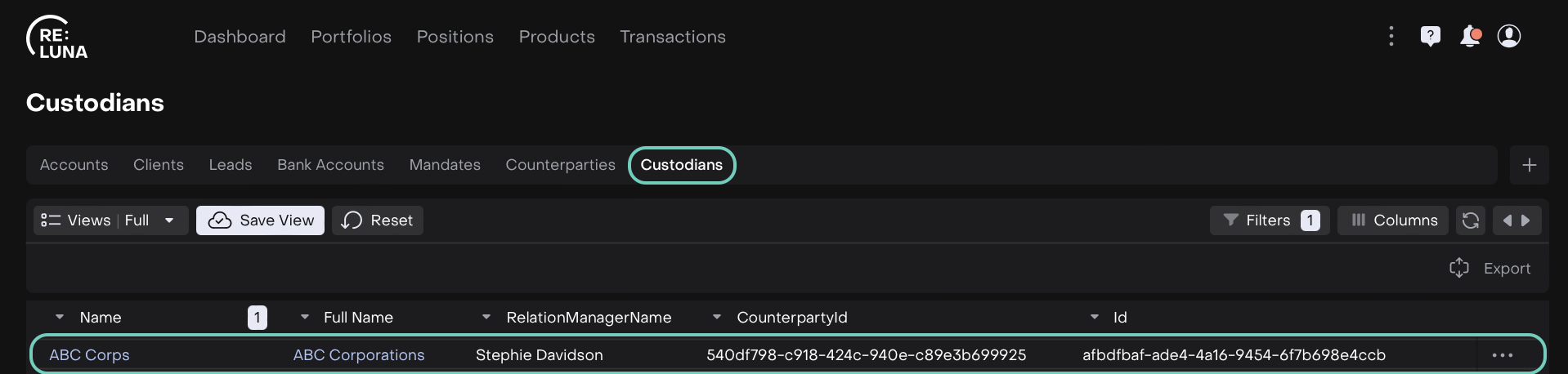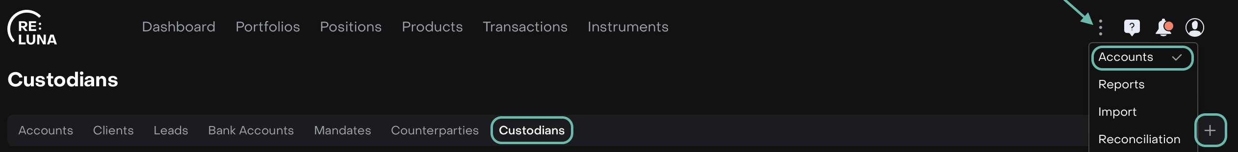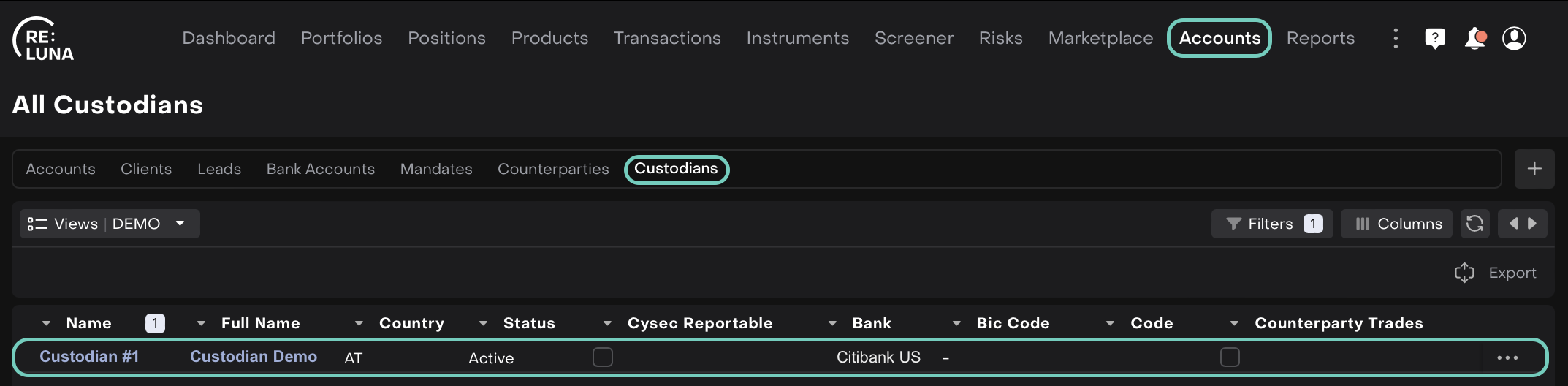 In the Reluna platform, custodians play a critical role in the management and administration of financial assets. A Custodian is an institution that safeguards client assets and handles settlements. In the platform, creating a custodian helps you manage positions, settlements, reporting, and compliance in a structured way.