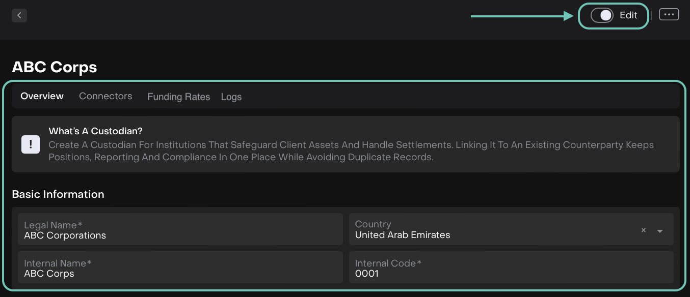 When you link the custodian to an existing counterparty, you keep all related data in one place and avoid duplicate records.