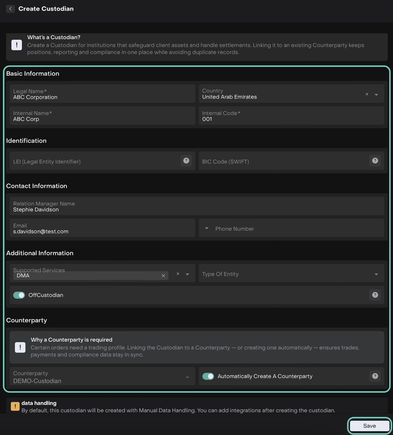 Linking a custodian to a counterparty — or creating one automatically — ensures that: