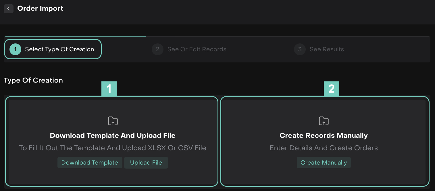 Import File | A CSV or XLSX file containing order details that you upload to the platform. |