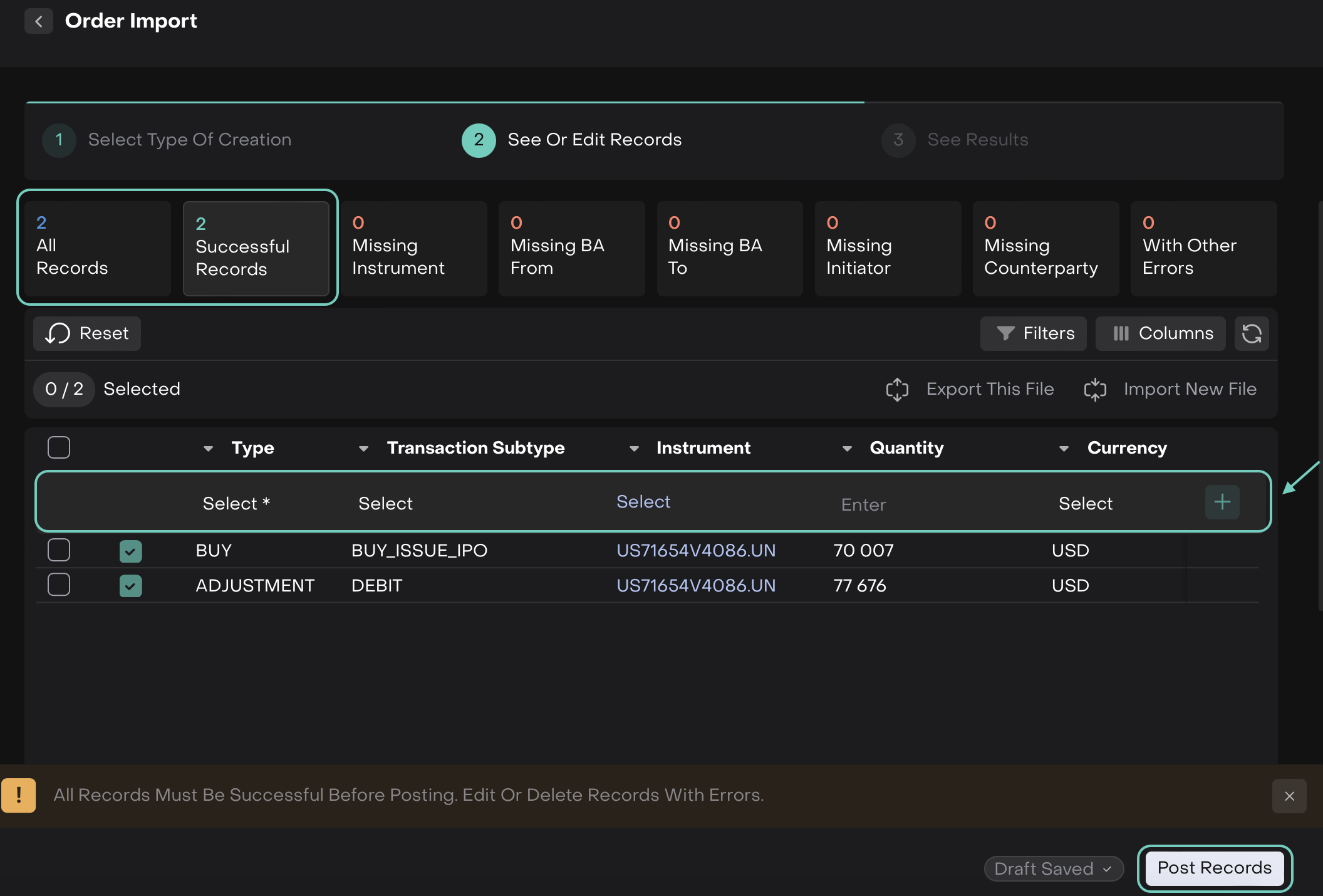 Post Records | The action that moves successful draft records into the Orders tab. |