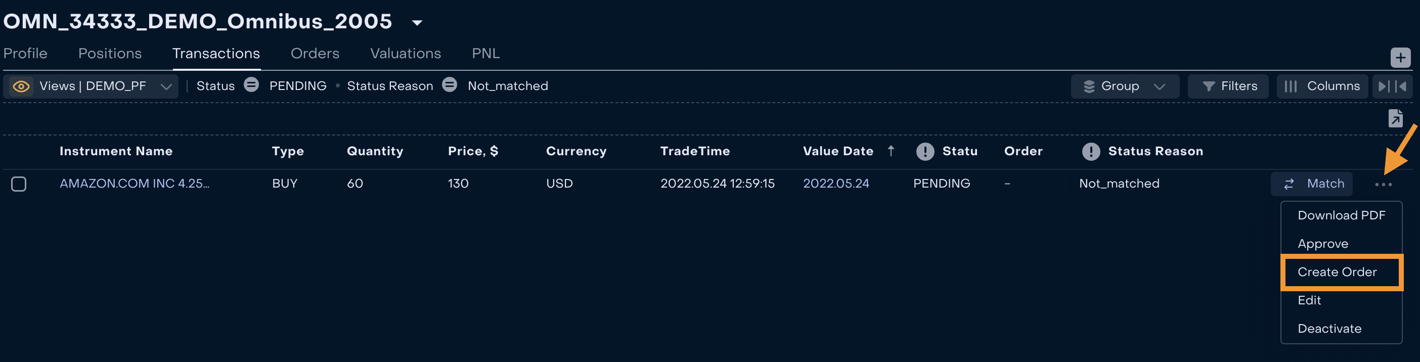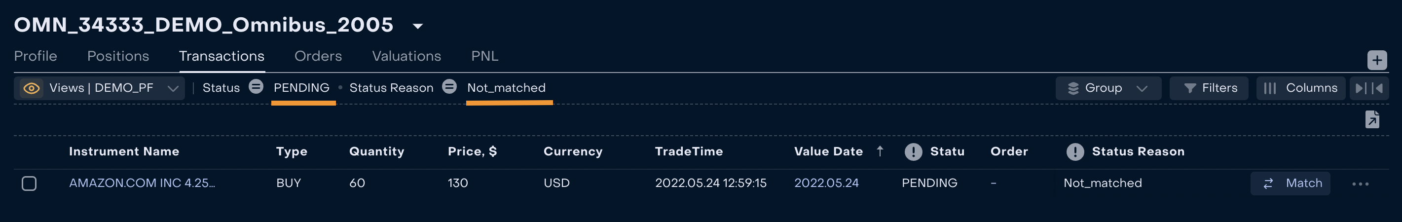 Back Office Manager keeps track of transactions in Status “Pending” and Status Reason “Not_matched” on Omnibus Portfolio (Omnibus Portfolio → Transactions)