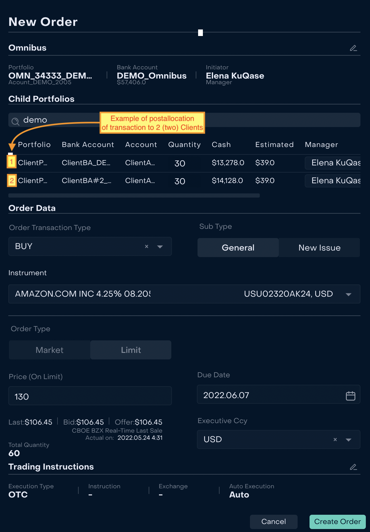 If received transaction is related to several Clients Back Office Manager should create 1 (one) Order and identify in its Child Portfolios allocation (Quantity) for each Client.