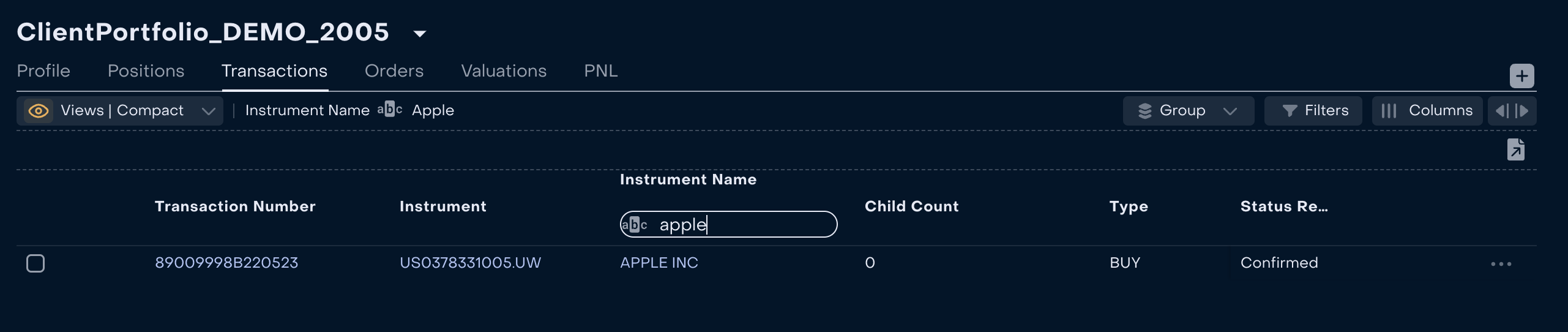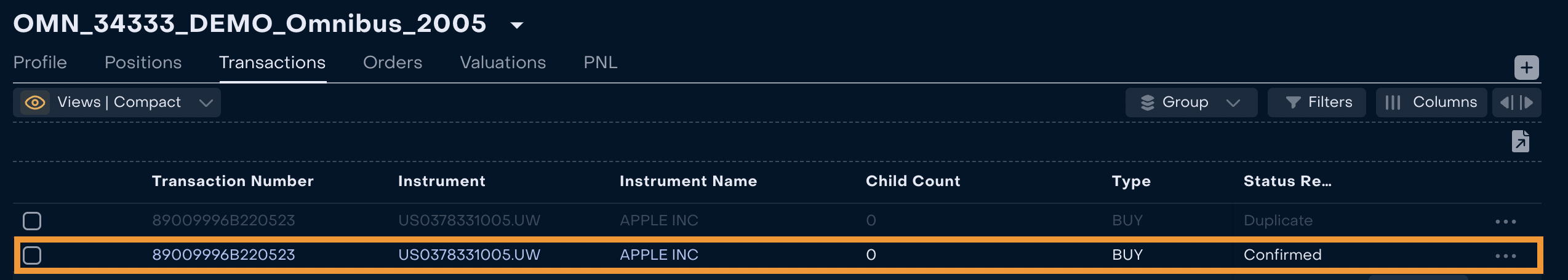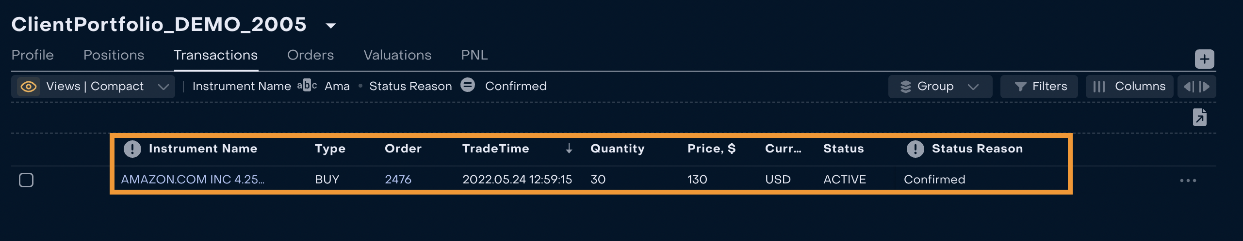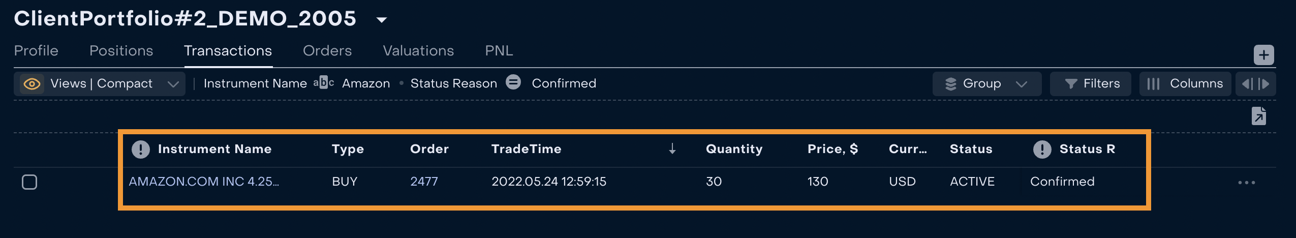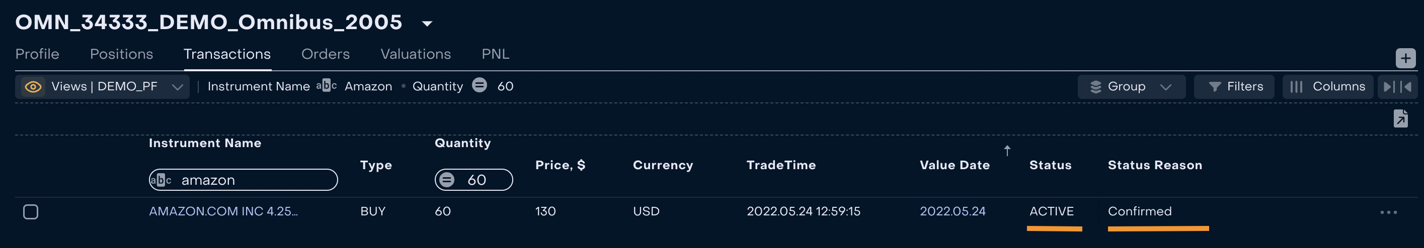 3. When the Order is created and executed, Back Office Manager can control that transaction received Status “Active” and Status Reason “Confirmed” via Omnibus Portfolio → Transactions.