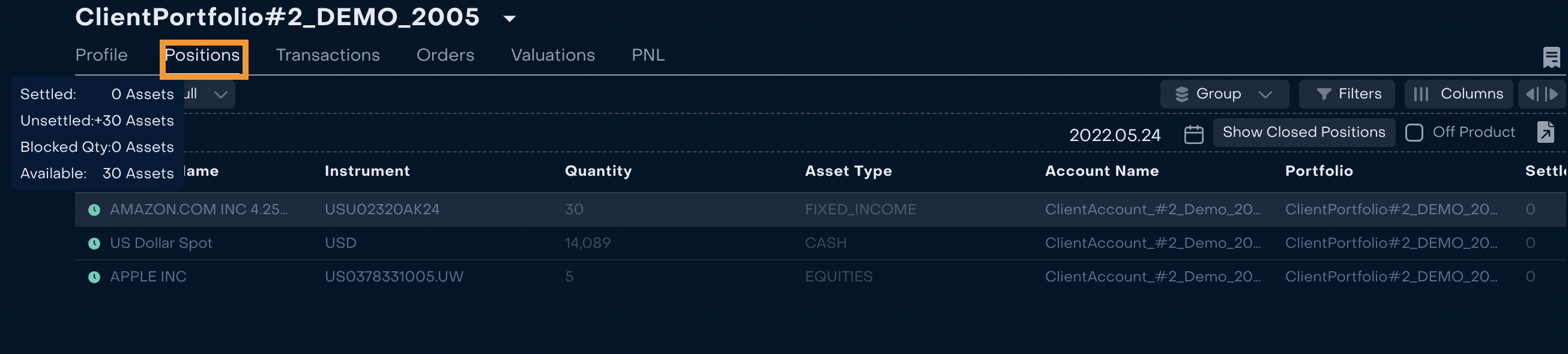 Positions are updated correctly in the Client Portfolio