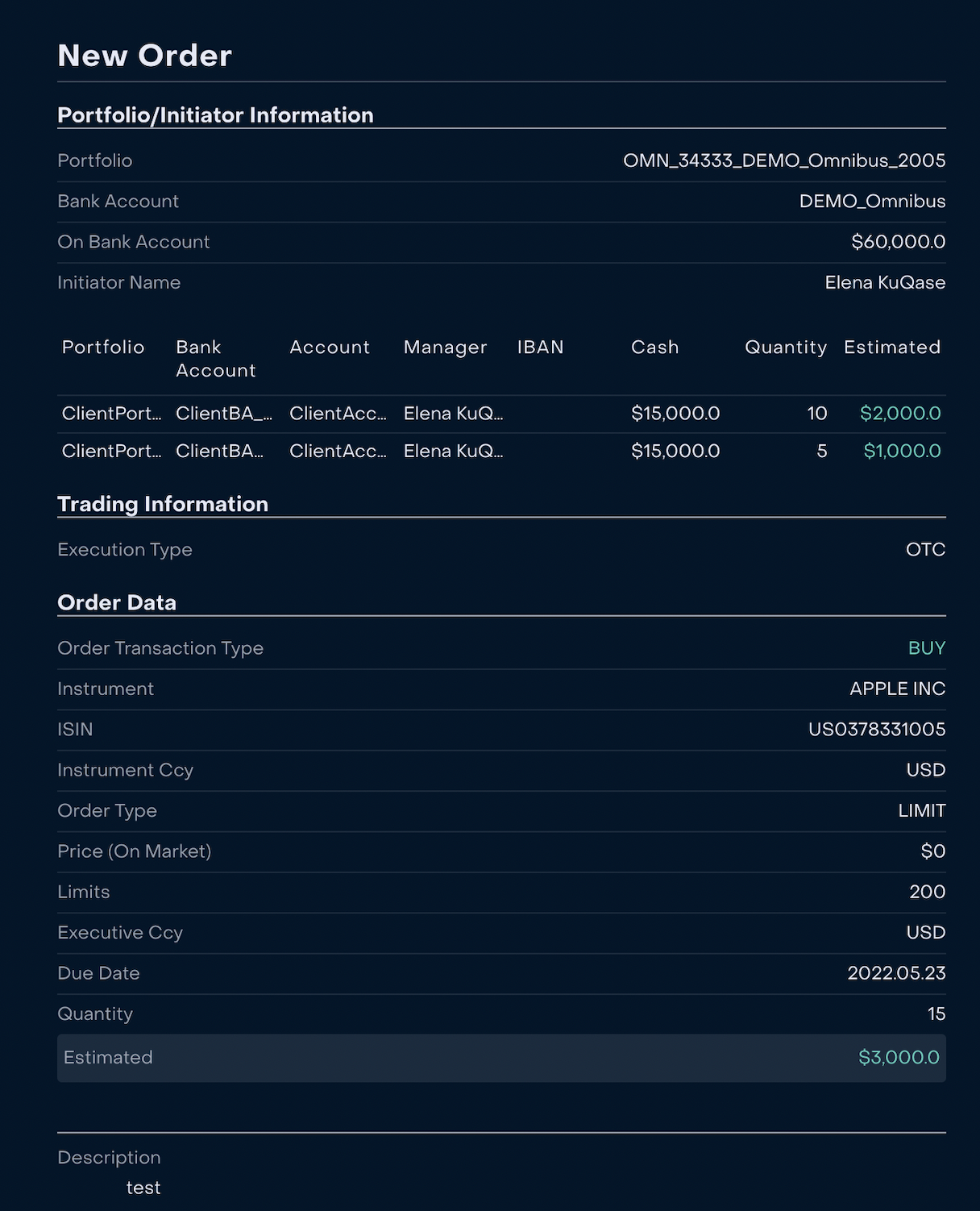 2. When the Order is created, Back Office Manager can control it via Omnibus Portfolio → Orders.