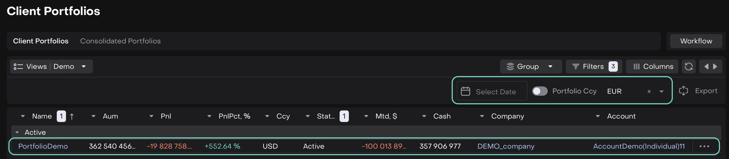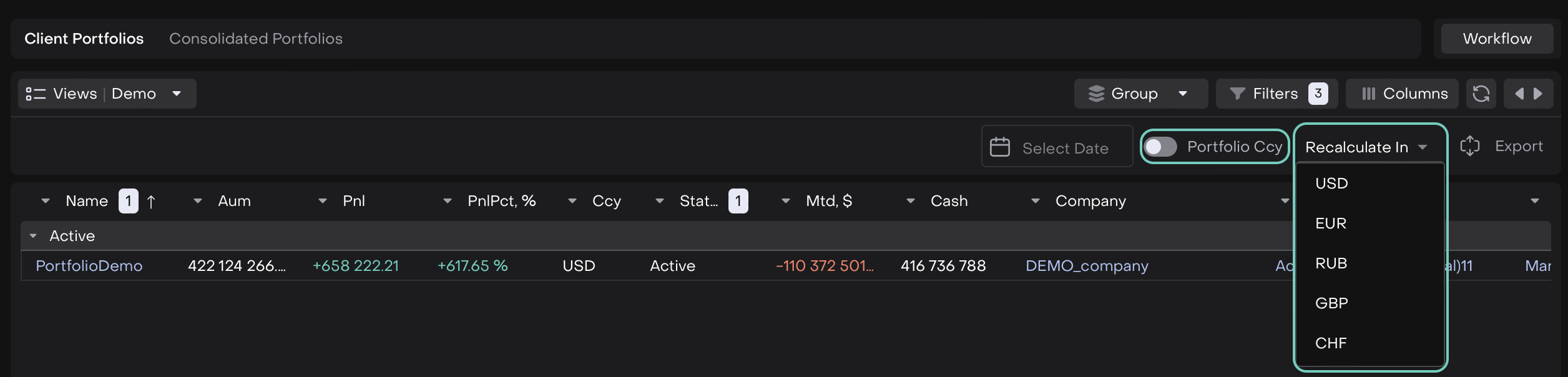 By default, your Portfolio Cash, AUM and PNL are displayed in the portfolio’s base currency for today.