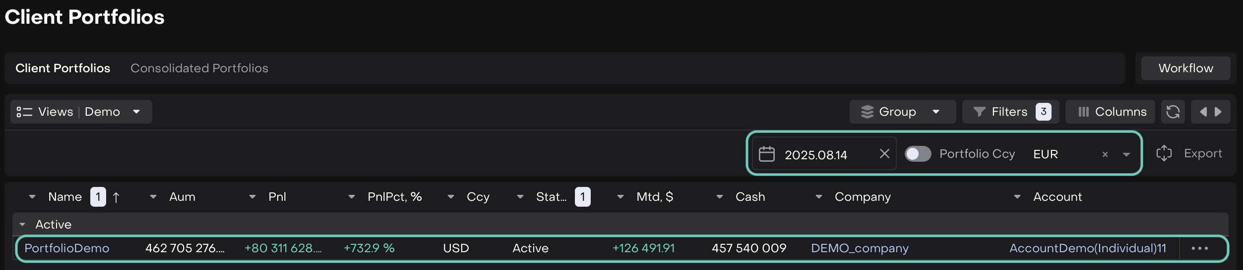 If you select EUR and set the date to 2025.08.14, the platform will recalculate and display your Portfolio Cash, AUM and PNL in EUR as of that date.
