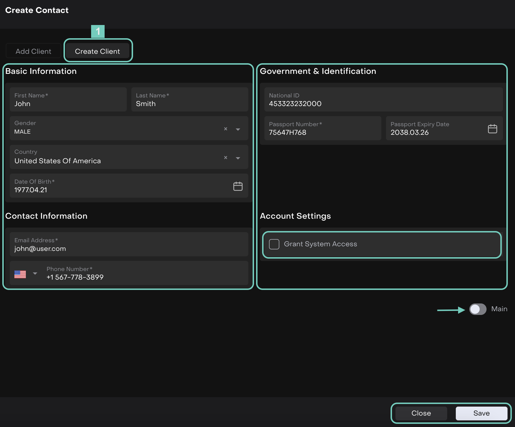Clients can be created manually by going to an existing Account and adding their details under the "Contacts" tab.